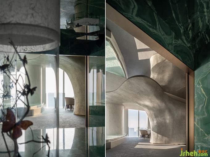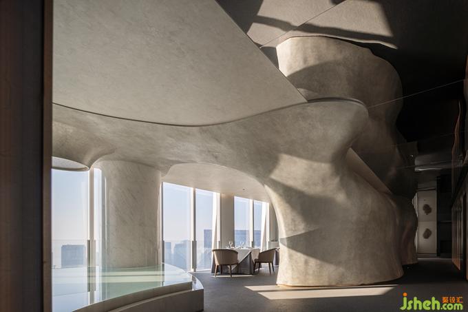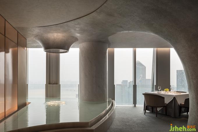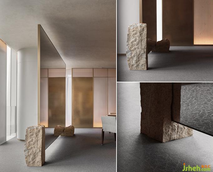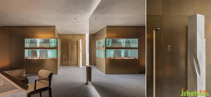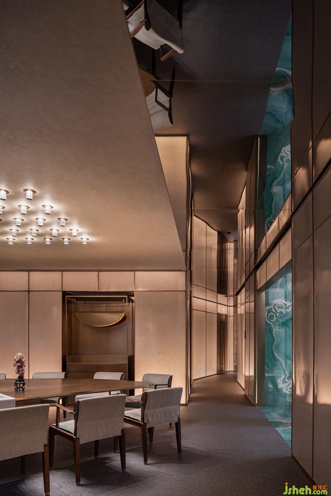 茶,作為潮汕與江南文化的連接點(diǎn),濃淡之間浸潤關(guān)聯(lián)著生活習(xí)性乃至精神情感。水,更是嶺東門戶與魚米之鄉(xiāng)共通的根脈。電梯通道的一端為品茗區(qū),粗糲的原石落點(diǎn)于直線切割的簡勁空間形制,雅樸的山石肌理與遠(yuǎn)眺的山景靜默對(duì)話。另一端為正廳散座區(qū),有機(jī)起伏的異形銀箔墻體回應(yīng)錢塘江漲潮時(shí)的奔涌之勢(shì),端頭的水景觀與江景內(nèi)外交融,再以水瀑聲制造視與聽的最大張力。