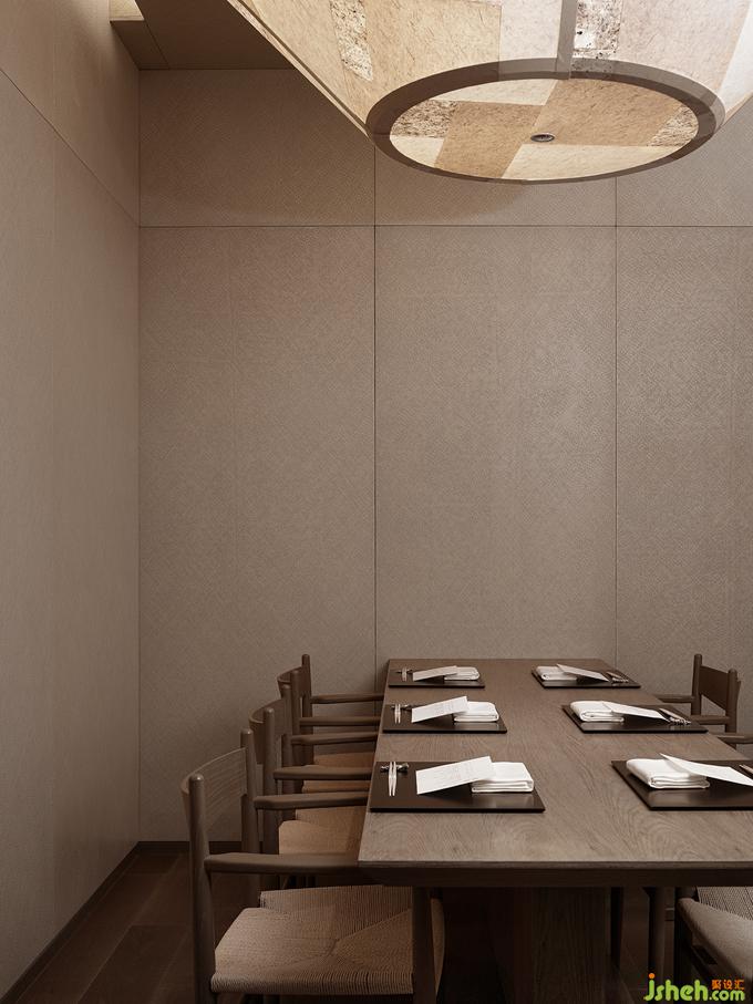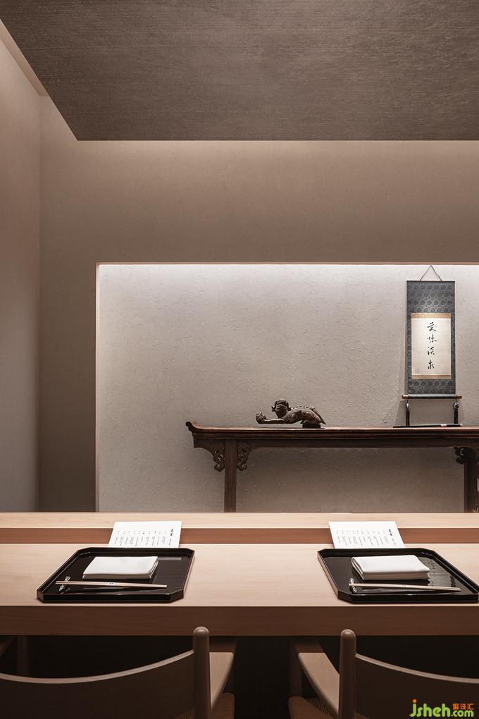 榻榻米包間藤席包裹起來的緊湊空間里沒有多余的裝飾,只開了一長條的窗洞,內(nèi)外框景里是東方的哲思,漂浮著的裝置因為不可觸碰更像是茶道空間里的奧,在留白和豐盈的取舍里,見天地的廣袤,見個體的渺小。