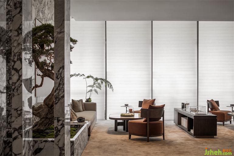 游園的起始,從駕一葉扁舟開始。接待區(qū)的背景屏風(fēng)若重疊的船帆,美學(xué)館設(shè)計(jì)也似自繁忙的運(yùn)河轉(zhuǎn)入了幽曲的水道,屏風(fēng)上綽綽的竹影是從鄭板橋《墨竹圖》里提取的筆意,引導(dǎo)來(lái)者婉轉(zhuǎn)入深林。而這位“揚(yáng)州八怪”里的代表人物,的確也代表著揚(yáng)州的人文風(fēng)骨。