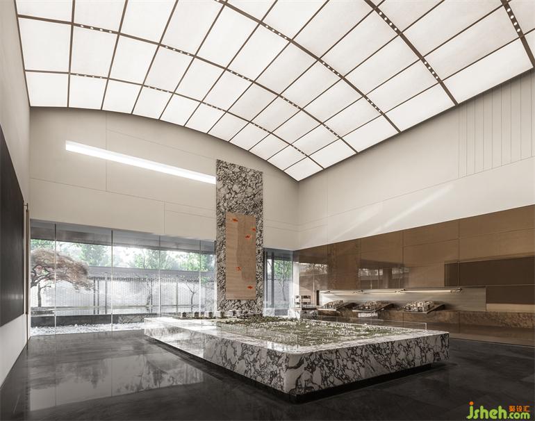 行至沙盤區(qū),風(fēng)景頓覺豁然開朗。運(yùn)河上的橋拱化作空間里圓融的曲線形天花吊頂,其下的沙盤正如一艘滿載的貨船,橋與船的關(guān)系不僅令空間的故事張力彌漫開來(lái),美學(xué)館設(shè)計(jì)還穿越般再現(xiàn)了昔日漕運(yùn)繁忙的盛景。而現(xiàn)代感十足的材料與透光設(shè)計(jì),則在這蕩漾的古韻中平添一絲現(xiàn)代精神。
