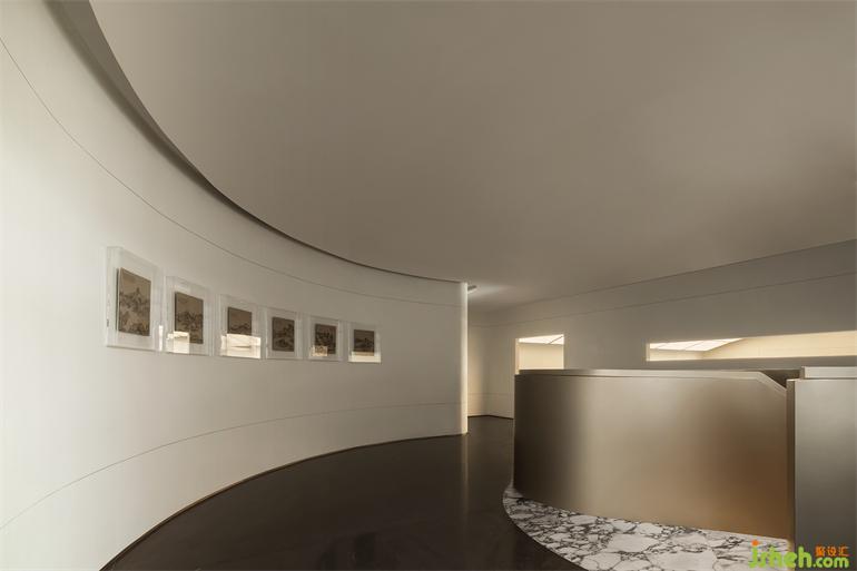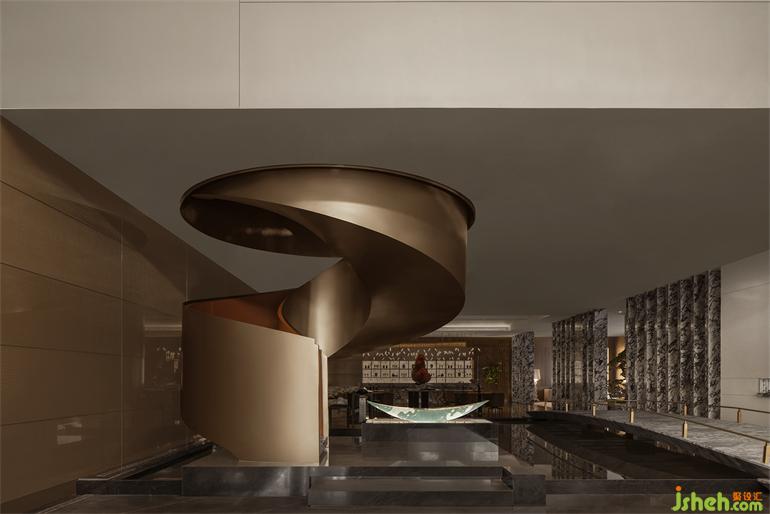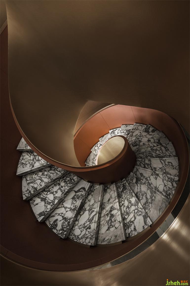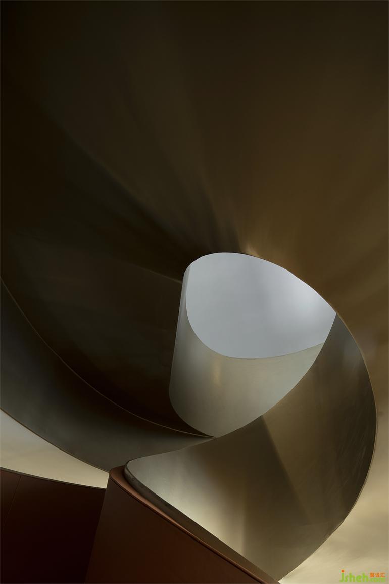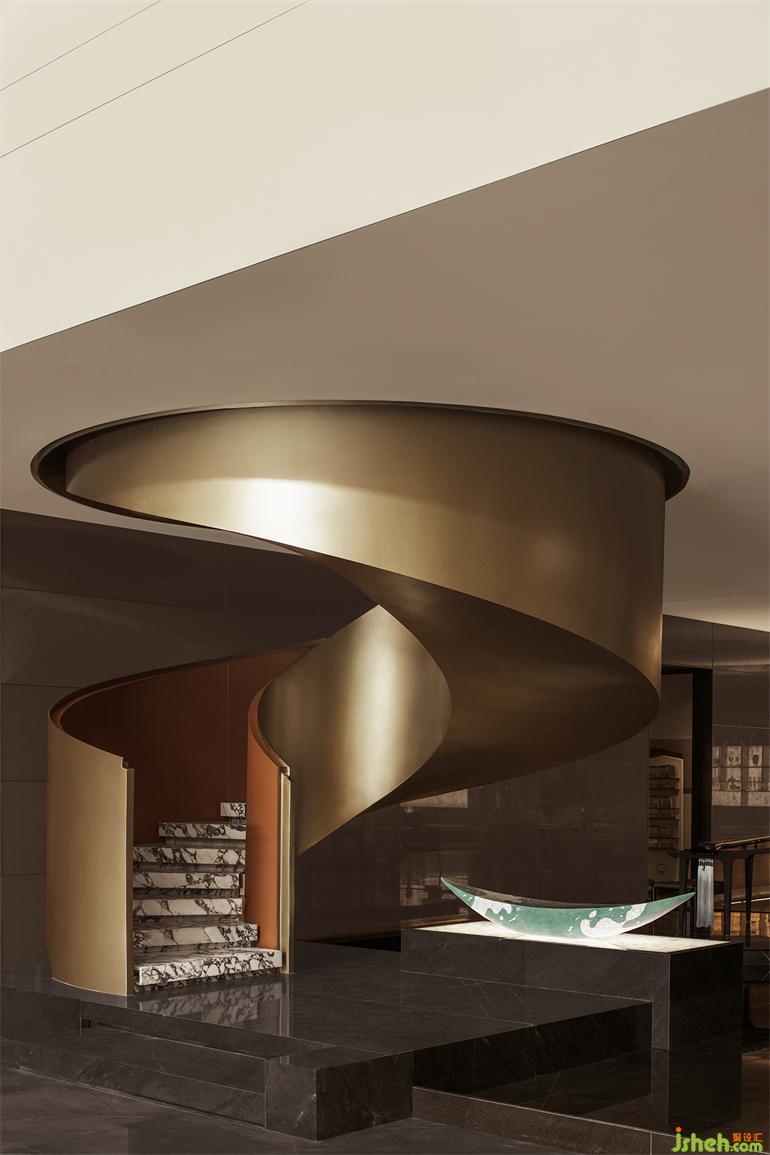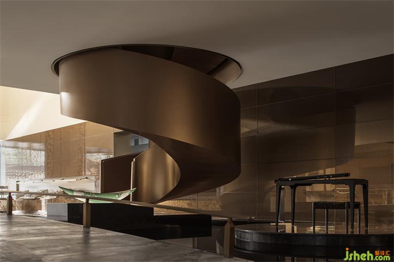 美學(xué)館設(shè)計(jì)空間中的視覺重點(diǎn)正是頗具現(xiàn)代感的金色旋轉(zhuǎn)樓梯,呈現(xiàn)出水與橋之間互文的流動感,又仿若連接傳統(tǒng)與現(xiàn)代的金色紐帶,瞬息間在文化的疊影里自在穿行。