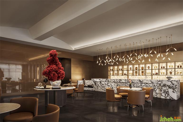 水景區(qū)域的設(shè)計(jì)仿佛空間里蕩開的一筆,畫卷正因這無所企圖的留白而頓時(shí)嫻雅了起來。亭、臺、橋、水元素被提取為簡潔的現(xiàn)代意象。美學(xué)館設(shè)計(jì)盈盈一水間的“戲臺”在曲水流觴的同時(shí)還享有聽覺加持,不論是撫一段琴曲,還是彈一支琵琶,都令立體空間感受更加余音繞梁。