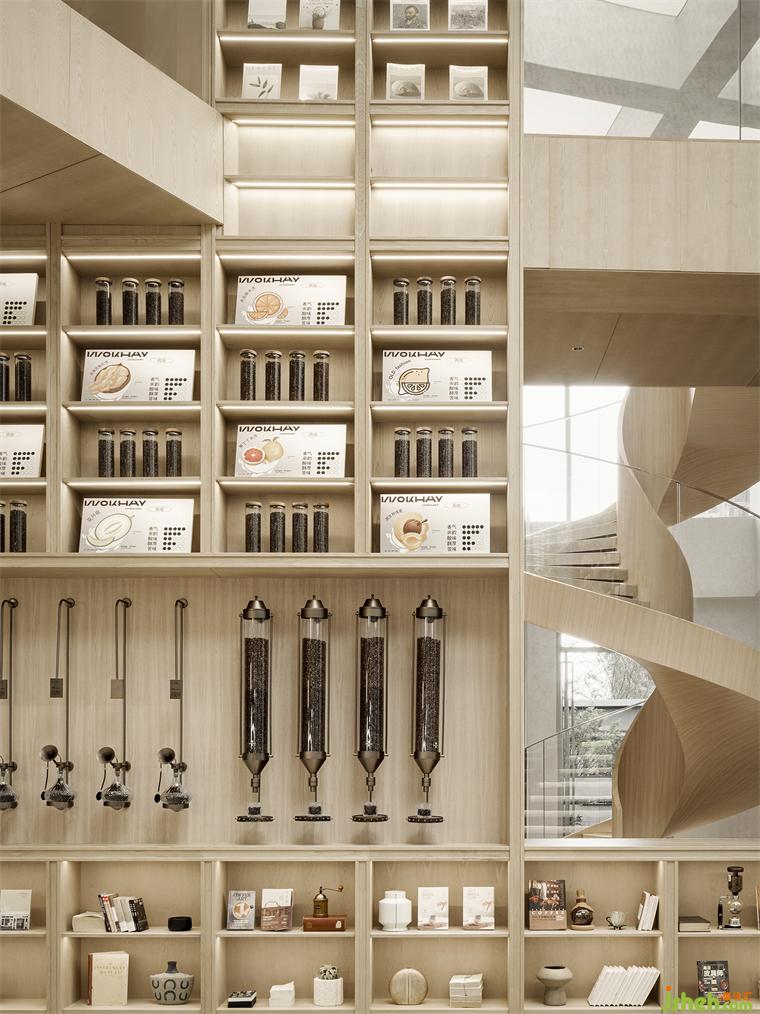 徜徉在昆明綠城&德潤(rùn)柳岸曉風(fēng)生活館中,一種“城市之中,游林之外”的意趣伴隨始終。入口處的接待區(qū),收束的空間起到了引入的作用,這里閑雅寧和的木色調(diào)與中性色調(diào)在金屬、石材和木材的協(xié)奏中表達(dá)了整個(gè)設(shè)計(jì)的主題——書香趣游。靈活的建筑體塊將挑高充裕的空間進(jìn)行了得宜且活潑的排布調(diào)動(dòng),在圖書館式的高闊書墻背景下,室內(nèi)設(shè)計(jì)師甚至形成了一、二層的動(dòng)線互文。至于書墻上那幅如手卷般橫向展開的藝術(shù)畫作則進(jìn)一步勾起“游人”的好奇,引人“緣溪行”,繼而忘路之遠(yuǎn)近。