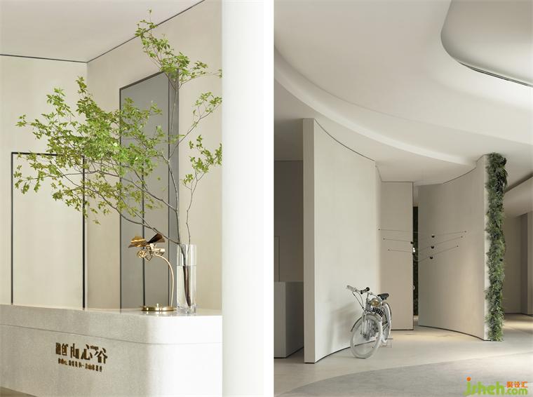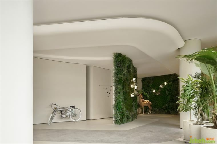 兩面花藝肌理的綠植墻,語調(diào)清新,青苔、花朵、室內(nèi)設(shè)計(jì)師和林間散步的小鹿,皆以藝術(shù)化的表現(xiàn)形式成為空間的一部分,呼應(yīng)了所處的自然溪谷絕妙的自然氛圍,成為了空間的主導(dǎo)。