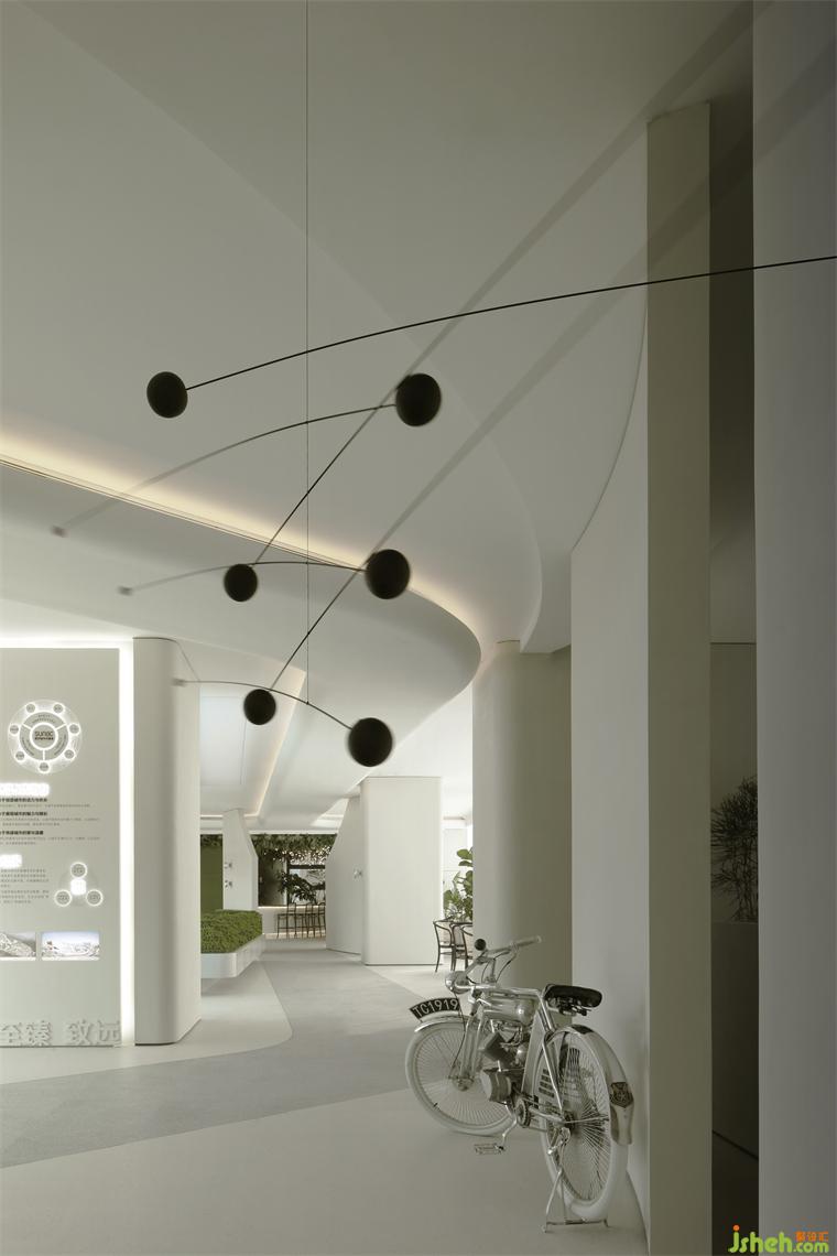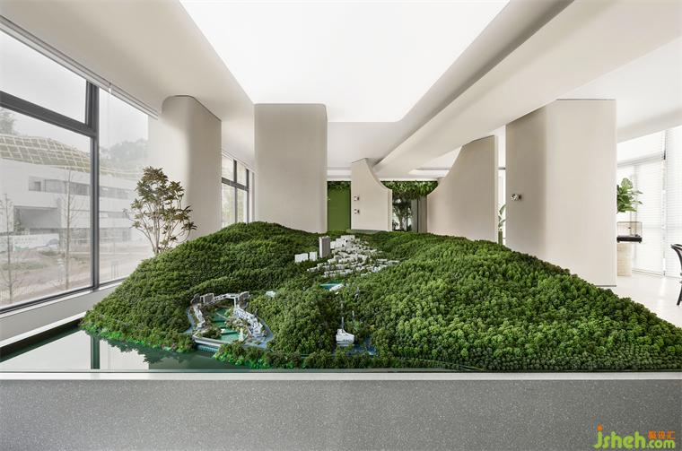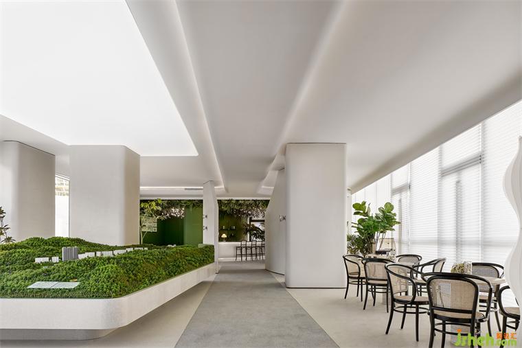 沙盤區(qū)與洽談區(qū)規(guī)劃為一處,室內(nèi)設(shè)計(jì)師兩面對外的落地窗將室外盎然的山水風(fēng)景收進(jìn)視野,曲線優(yōu)雅的編織藤椅略帶浪漫屬性,為舒適的談話、休憩提供了全然放松的環(huán)境氛圍。