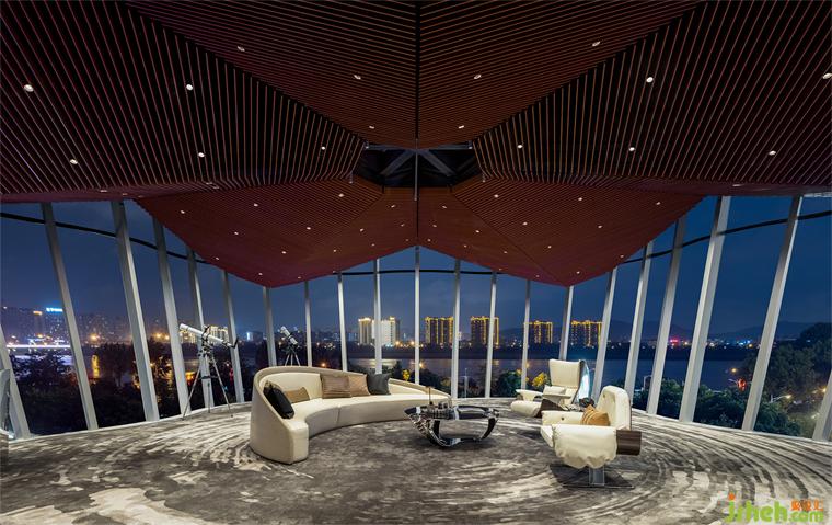 整個空間的高潮在步入觀江廳那一刻降臨,如同奏響的華彩樂章,壯麗的湘江景色從無邊界的全景落地窗中四面襲來,令人有種淚盈于睫的震撼。此觀江功能平臺是一個可在二層與三層間自由升降的裝置,裝修設計以長沙市花“杜鵑”為藝術靈感,天花結合現(xiàn)代科技,能隨時間開闔,如同花瓣般圍合盛放、引景入室。