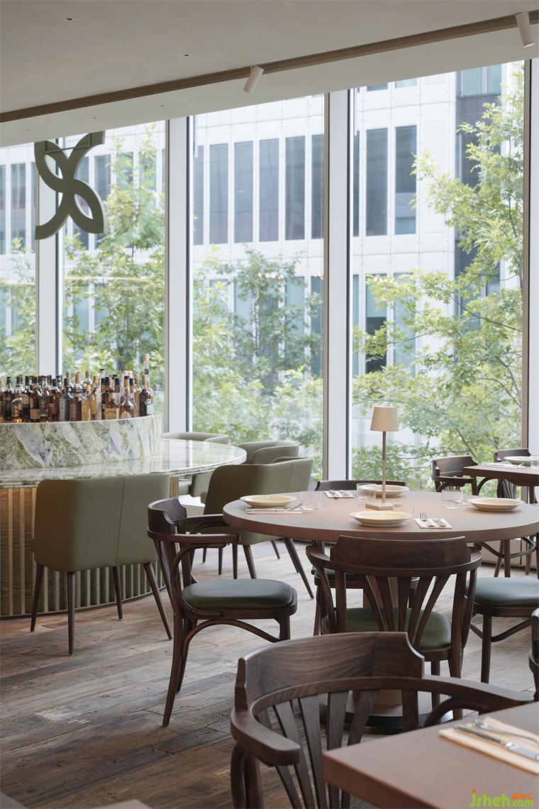 翡翠綠大理石紋理如甜點(diǎn)般質(zhì)感,搭配以綠色橡木紋理材質(zhì),餐廳設(shè)計(jì)整體以一種優(yōu)雅的姿態(tài),在餐廳入口的不遠(yuǎn)處,靜候客人的到來(lái)。