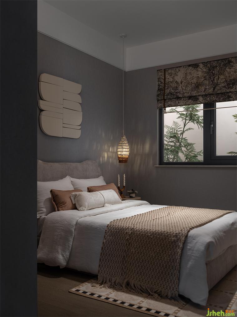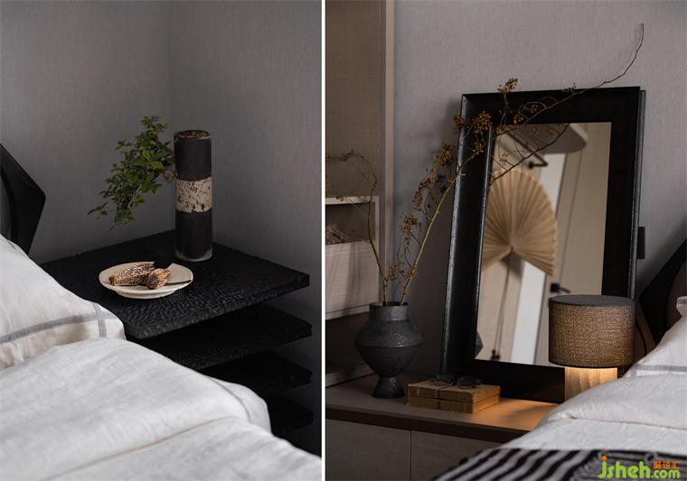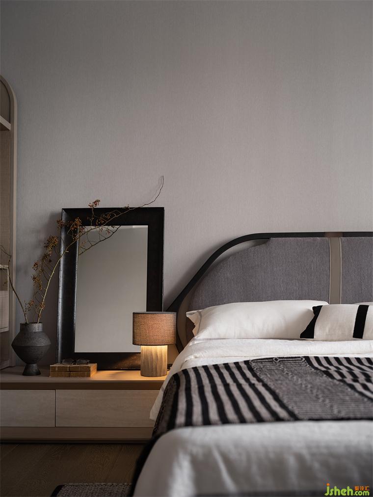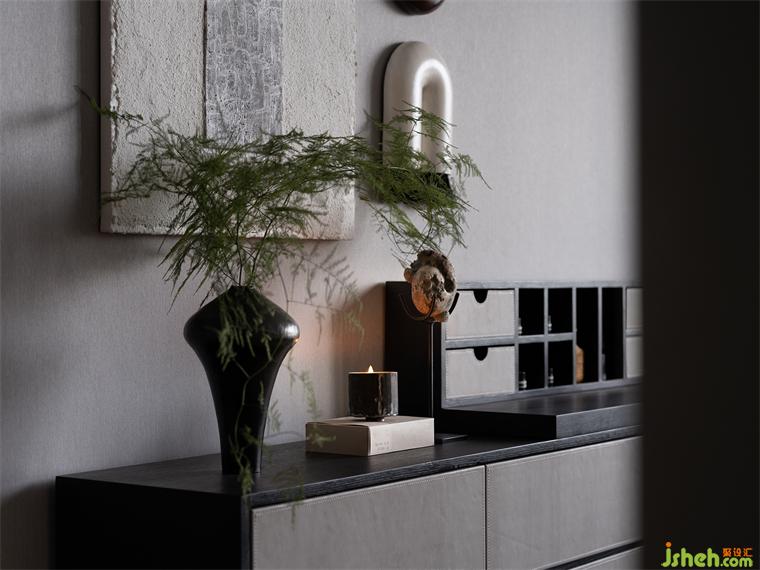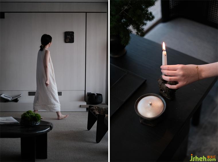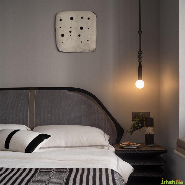以窗外的方山為背景,室內(nèi)灰色系蔓延著寧靜隱逸,竹燈與蒲扇,則醞釀著一場深沉的夢。裝飾的石版畫滌除著雜思,訴說著山的自白。這是一場隱入山野的夢境,又或是一次將世界隱于自我的回歸。