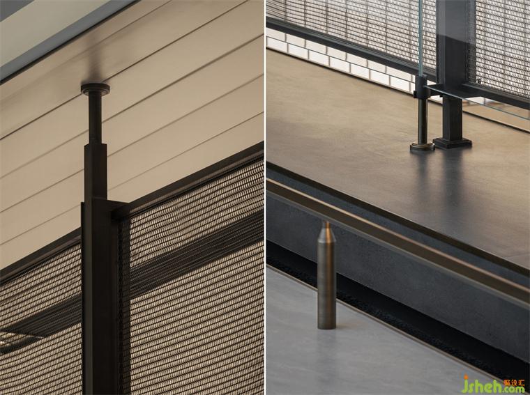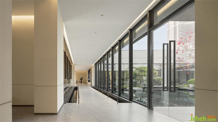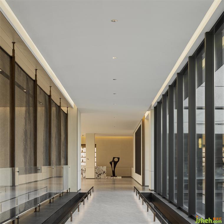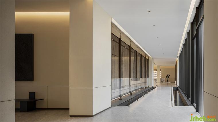 電梯廳的巖石壁畫與苔盆景營造出山行的意蘊,而一旁影音室里簡潔的皮質家具與黑白抽象掛畫又營造出簡凈的現代感。連廊一側毗鄰中央庭院,明亮的光線引人前行,而盡頭處層層交疊的門洞仿佛重屏框景,裝修設計令人如入畫境。