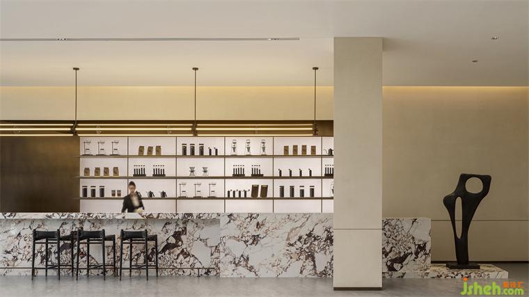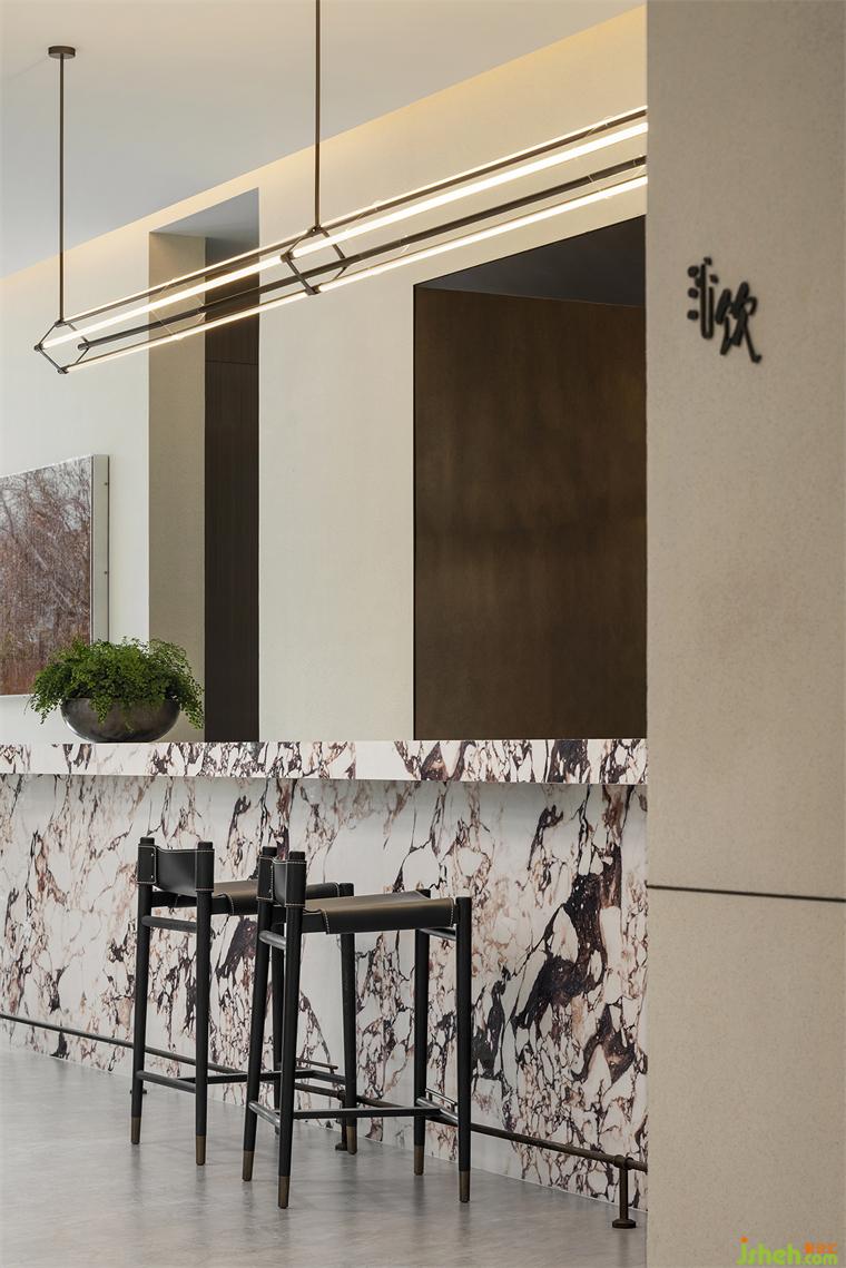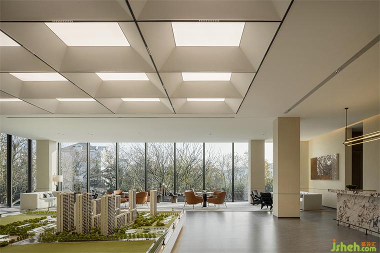 進入洽談與沙盤區(qū),整個空間頓時平直開闊、氣韻沛然。大理石吧臺的天然石紋猶如萬頃波濤,洶涌著這座城市的海之浪漫。沙盤區(qū)域上方的格狀吊頂將燈光幻變出藝術魔力,更顯大氣。洽談區(qū)靠落地玻璃墻一路延展,奶油白、石黑、落日橘色的藝術家具沐浴在溫好的日光中,讓一切都那么熨帖和自然。