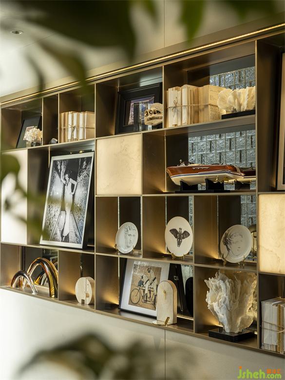 半透明的玻璃磚隔斷將室內(nèi)的金色元素折射成
