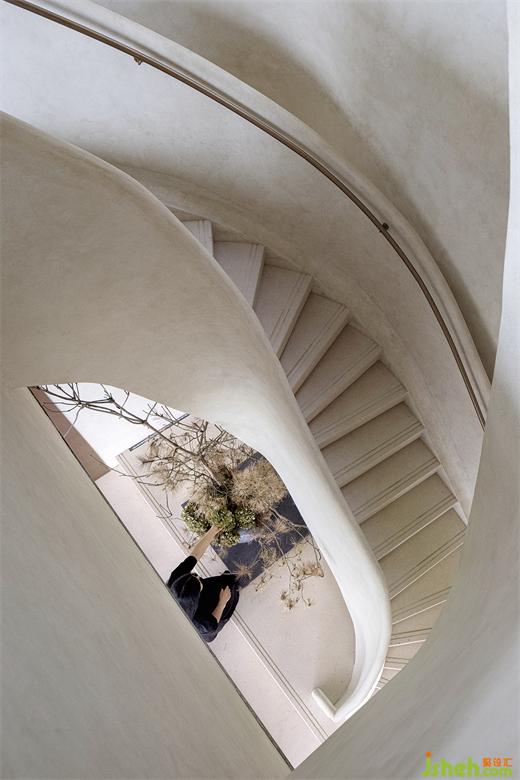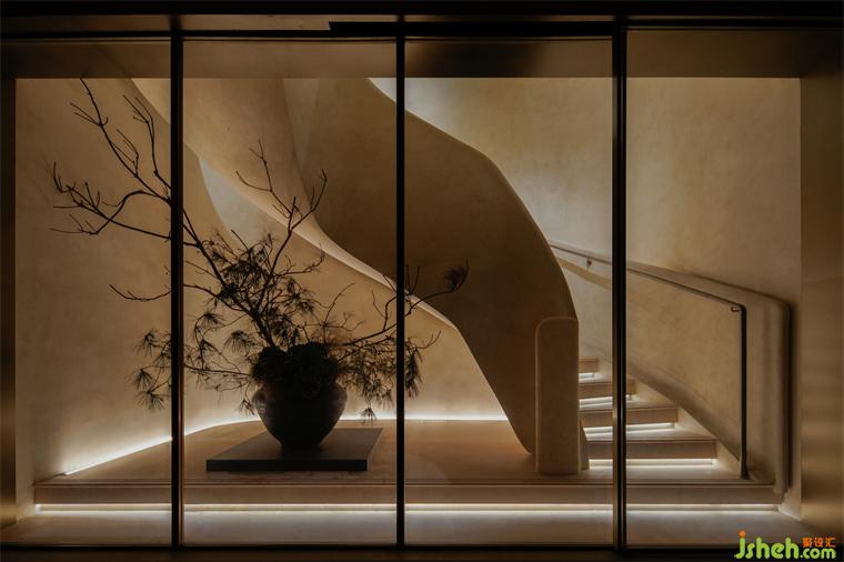 沿天光樓梯緩步而下,天色入室,仿佛溯游于山谷之中。至架空層,一側肆意生長的松枝藝術品將人引入山居秘境。