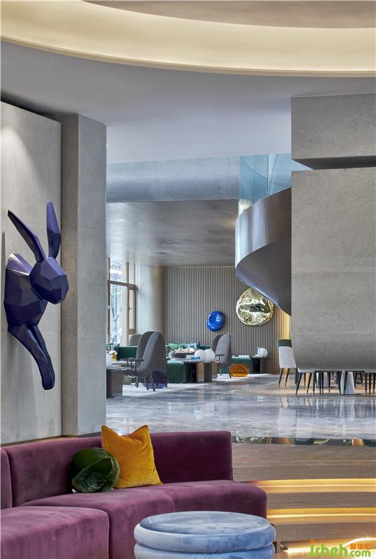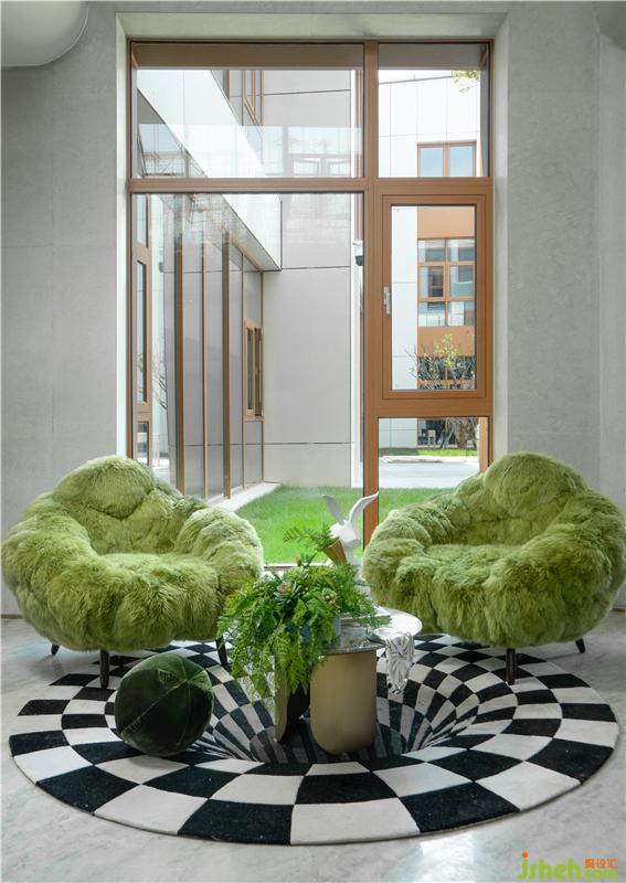 綠色絨毛座椅好似柔軟的青苔,小憩于此,仿佛聞到雨后的清爽氣息。黑白格子組成的地毯仿佛不停下陷,即將墜入另一層夢境,是兔子先生的魔法??臻g如盤旋交錯的夢,令人游走在真實和虛幻中。