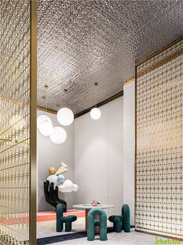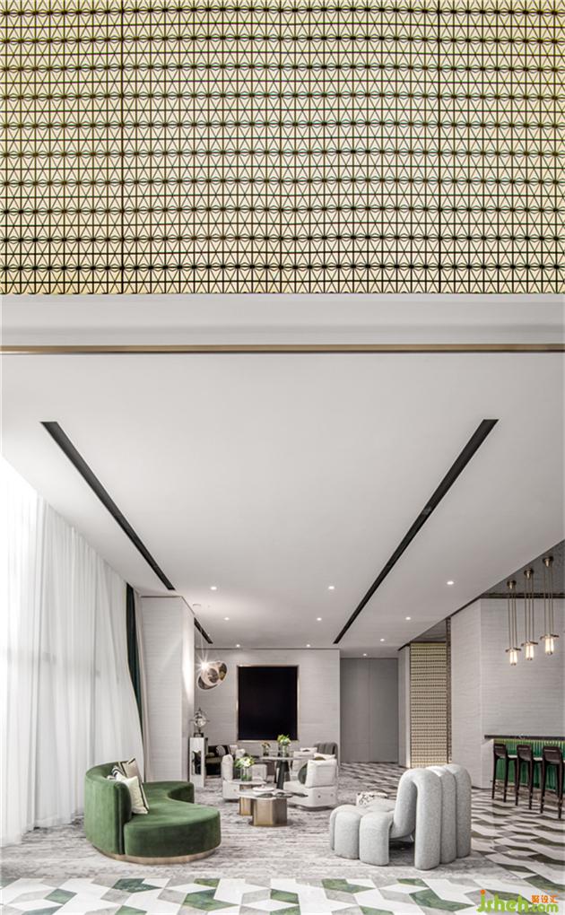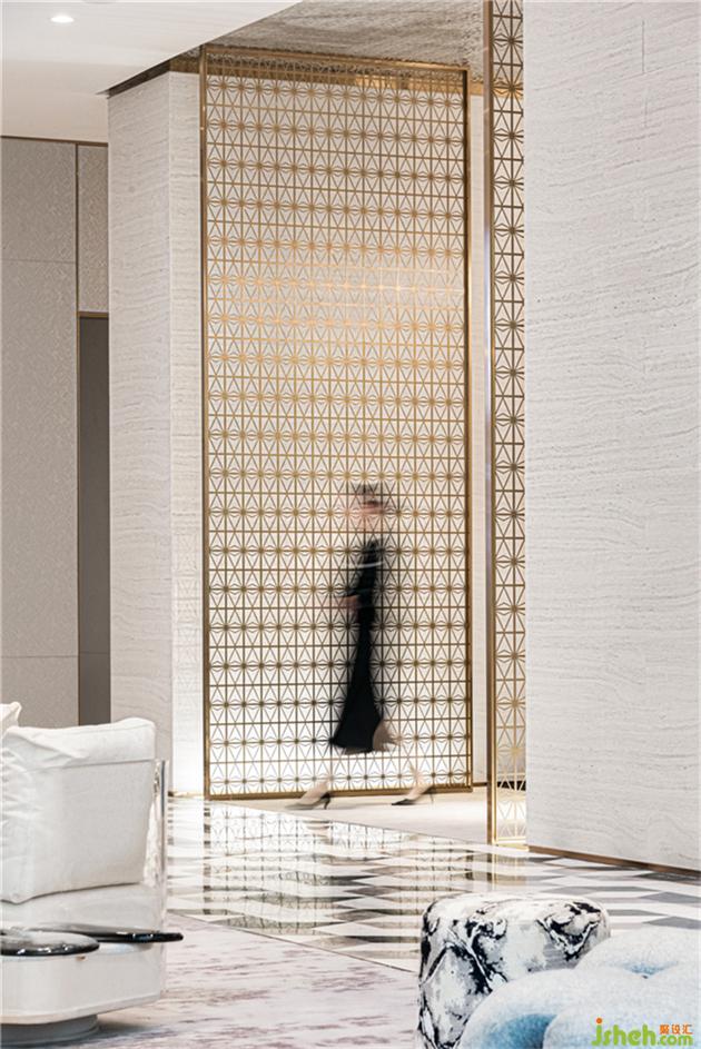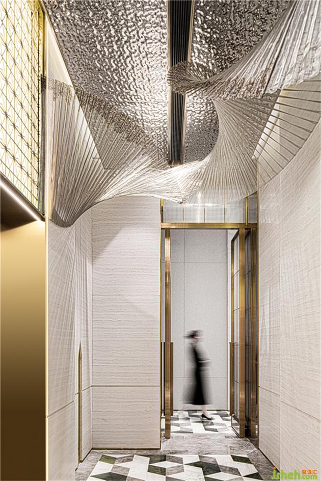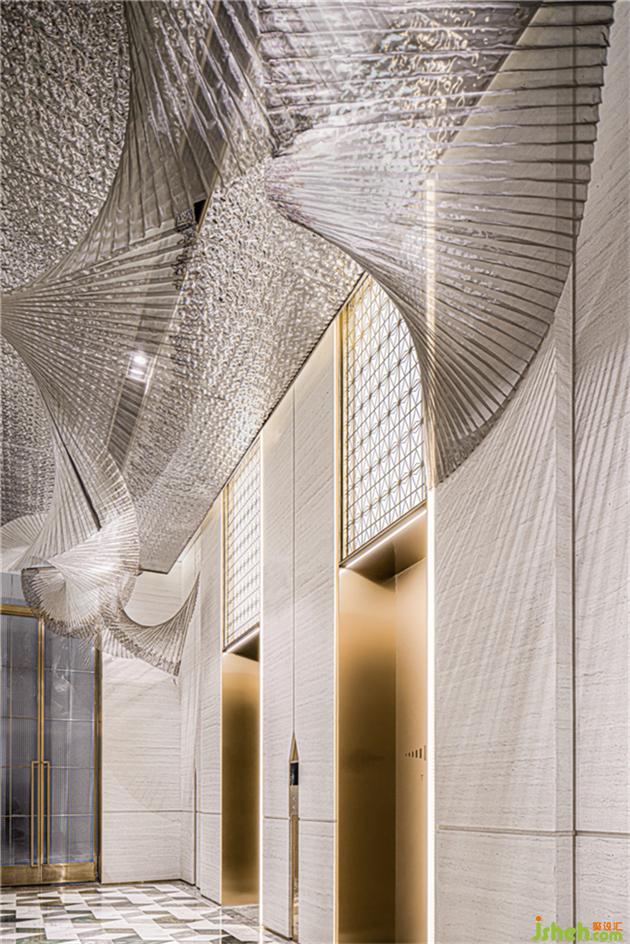 設(shè)計(jì)師從珠寶的星芒擷取設(shè)計(jì)元素,將鉆石的幾何切割和光輝反射通過(guò)抽象化處理,融入到室內(nèi)空間的材質(zhì)及形態(tài)中。電梯廳雖為暗空間,通過(guò)頂面水波紋板的材質(zhì)以及整個(gè)藝術(shù)天花的光影增加層次,增大了空間的視覺(jué)張力。售樓處設(shè)計(jì)