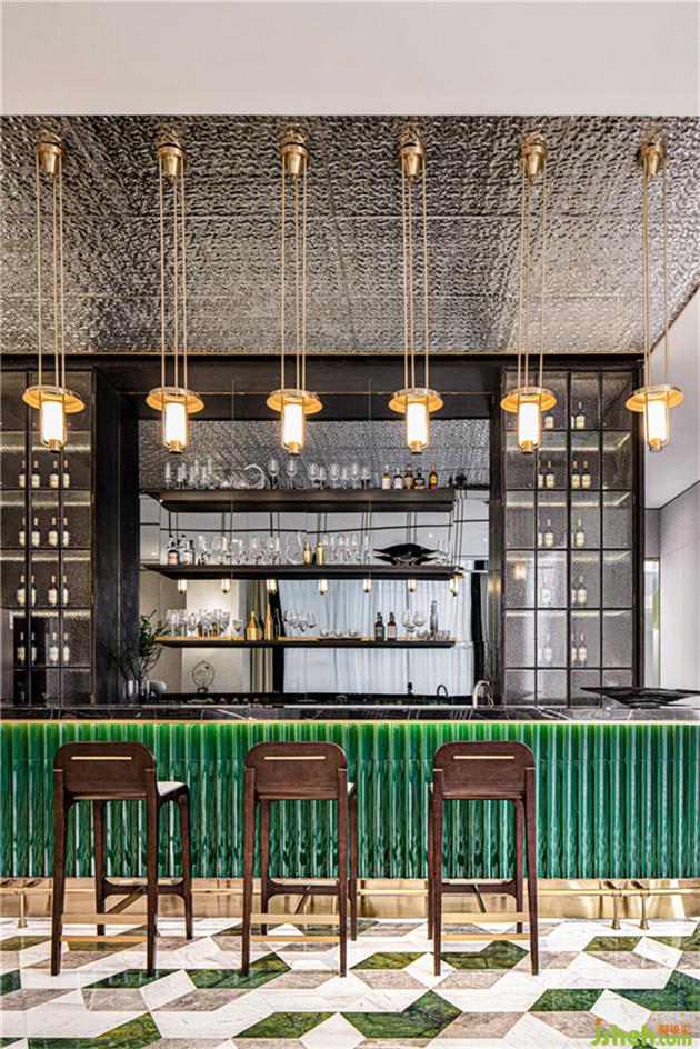 設(shè)計(jì)師在空間里通過(guò)鏡面反射以及光影的表達(dá)來(lái)增強(qiáng)空間的藝術(shù)調(diào)性,象征珠寶堅(jiān)固、閃耀、恒久遠(yuǎn)的特性。色調(diào)呼應(yīng)主題選用寶石翡翠的綠色作為整體空間的主題色,將室外景觀最大限度地帶入室內(nèi),突破建筑位于地下層的空間局限性,進(jìn)而予人沉穩(wěn)舒心的空間感受。