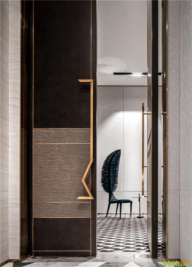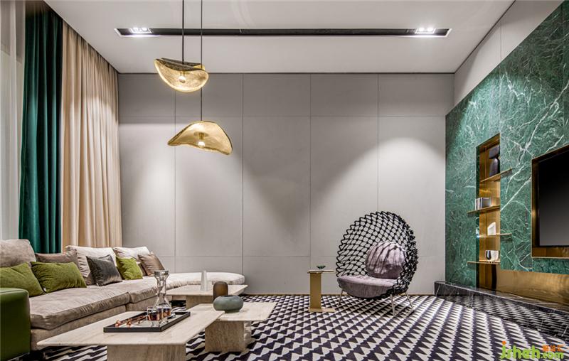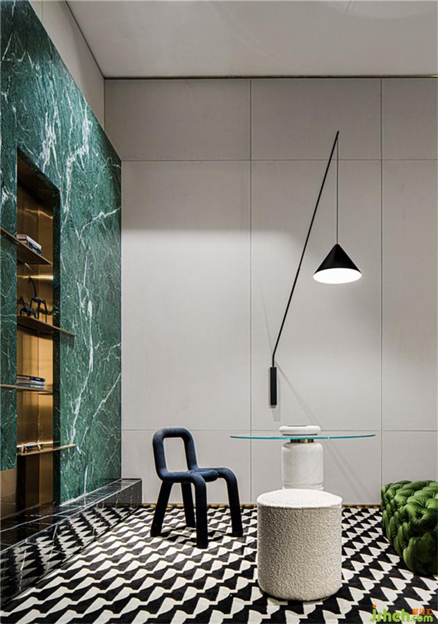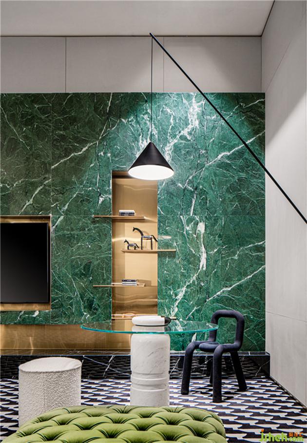 裝飾墻采用有著高雅品味的翡翠綠大理石,和燈具輕盈金屬的組合下內(nèi)斂綻放。