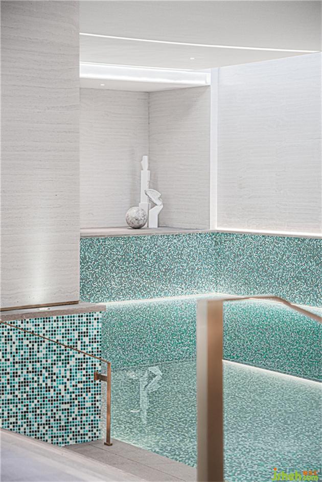 水,象征能量與活力,中國(guó)人更將水視為源源不絕的輪轉(zhuǎn)動(dòng)能。因此設(shè)計(jì)師將泳池水景設(shè)計(jì)在會(huì)所核心的功能區(qū)。在設(shè)計(jì)前期WJID與建筑設(shè)計(jì)緊密配合,盡可能的將自然天光融入地下空間,改善了地下密室化的局促感。泳池區(qū)域利用馬賽克玩味復(fù)古時(shí)尚元素,升華海派東方的藝術(shù)氛圍,有如值得細(xì)細(xì)把玩的珠寶,無(wú)論從哪個(gè)角度都值得贊嘆。
