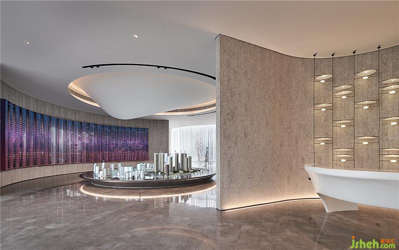 中心沙盤區(qū)同樣以藝術(shù)佐景,波濤洶涌的抽象江水映襯著未來的都市雛形,在圓融和諧的空間設(shè)計(jì)中,隱隱呼應(yīng)著魚躍龍門、奔流騰達(dá)的壯志豪情和都市精英積極躍然的生命姿態(tài)。