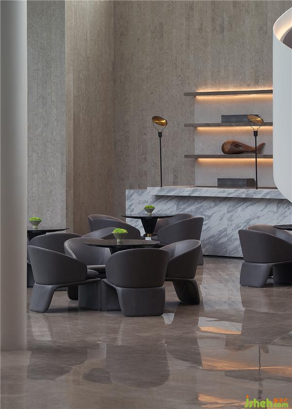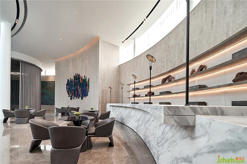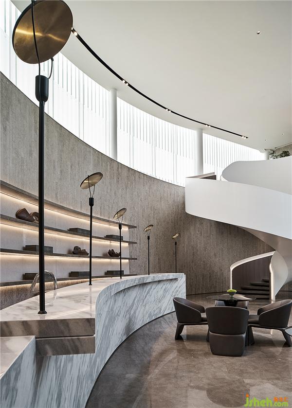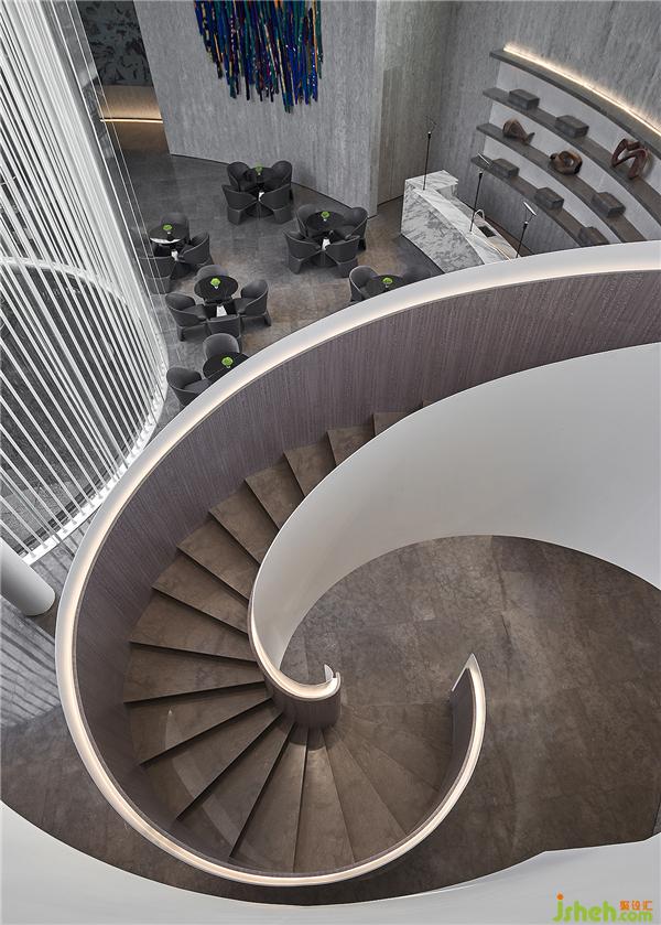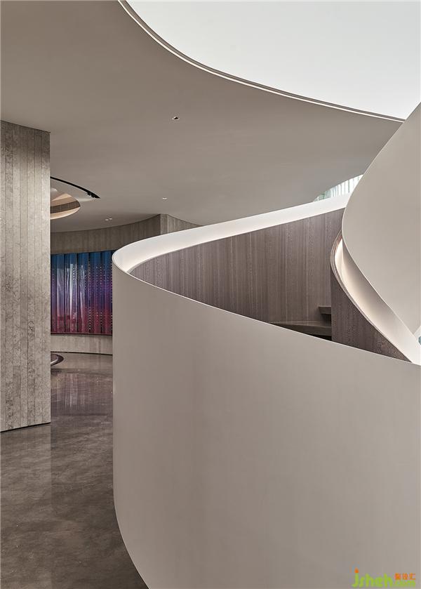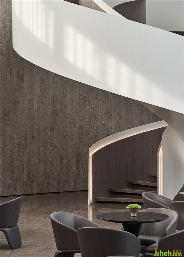 接待區(qū)與水吧區(qū)采用開放式景觀樓梯設(shè)計(jì),令人聯(lián)想到水中漩渦,賦予一種圓融、綿延、源源不絕的視覺感受。地磚光澤與墻面相互輝映,去除不必要的陳設(shè)擾動空間通透性,陽光與微風(fēng)自然充盈整個(gè)空間。會所設(shè)計(jì)
