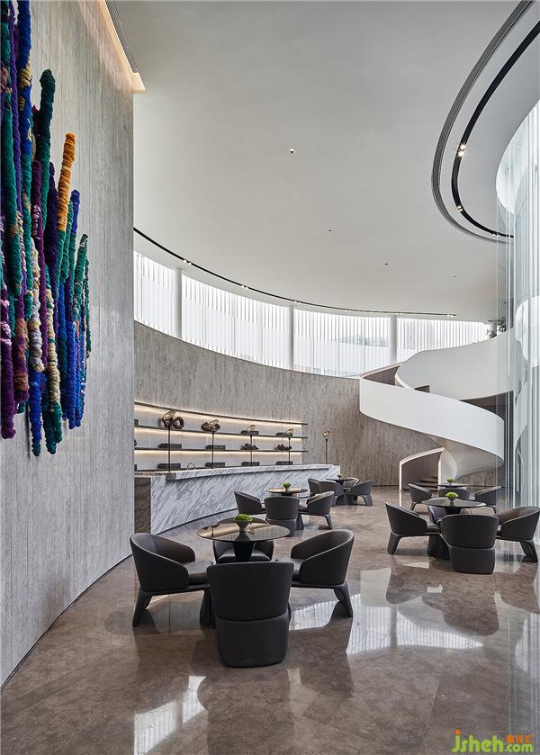 接待區(qū)內(nèi)展示的當(dāng)代藝術(shù)作品,采用綿、羊毛、亞麻和絲線等多種材質(zhì)彼此編織、纏繞,以重新定義纖維在藝術(shù)的意義,也為空間帶來溫暖多彩的想像空間。無論旋轉(zhuǎn)階梯,或是接待區(qū)水吧,都以開放式設(shè)計(jì)破除空間隔閡,打造場域自由開放感,光線透過大片玻璃窗穿入,使天色與庭院景觀融混日光涌入敞朗廳堂。
