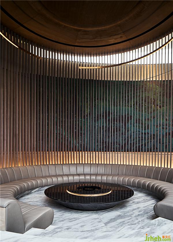 直線條的造型燈具,為圓弧的壁面和陳設(shè)帶來不一樣的視覺延伸,金屬質(zhì)感表現(xiàn)異材質(zhì)的特殊紋理。會所設(shè)計