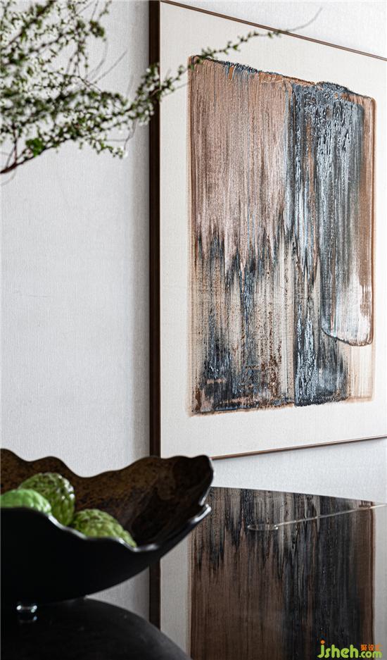次臥空間中,褐色壁面保留材質(zhì)本身的肌理,有著時尚大器的利落表情,白色的臺燈,黑色的床頭柜,看似冷硬的觸感,因?yàn)轷r花與藝術(shù)擺飾的巧妙中和,展現(xiàn)出細(xì)膩而生動的表情。