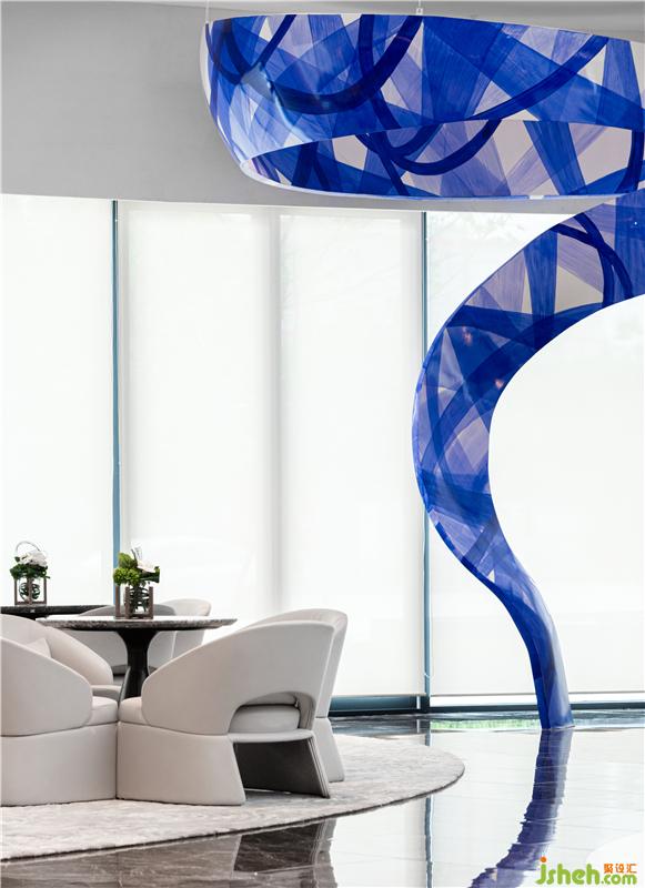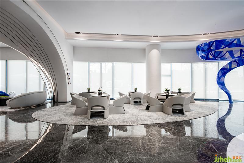 白色主調(diào)蘊(yùn)含靜謐,亮麗藍(lán)色潛藏活力。洽談區(qū)落地窗前擺放著多組圓桌沙發(fā),窗明幾凈,圓弧形屋頂下,既希冀著人們良好和諧的交流合作,也包容著愜意舒適的休閑氛圍。娓娓道來的需求和想法,循序漸進(jìn)的深淺洽談,在此徐徐展開。有緣而聚,和而不同。裝修公司