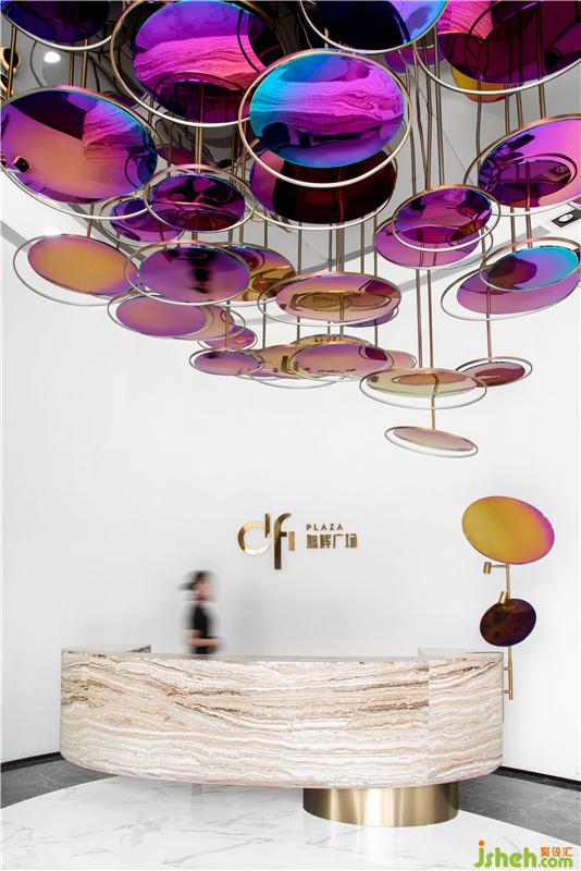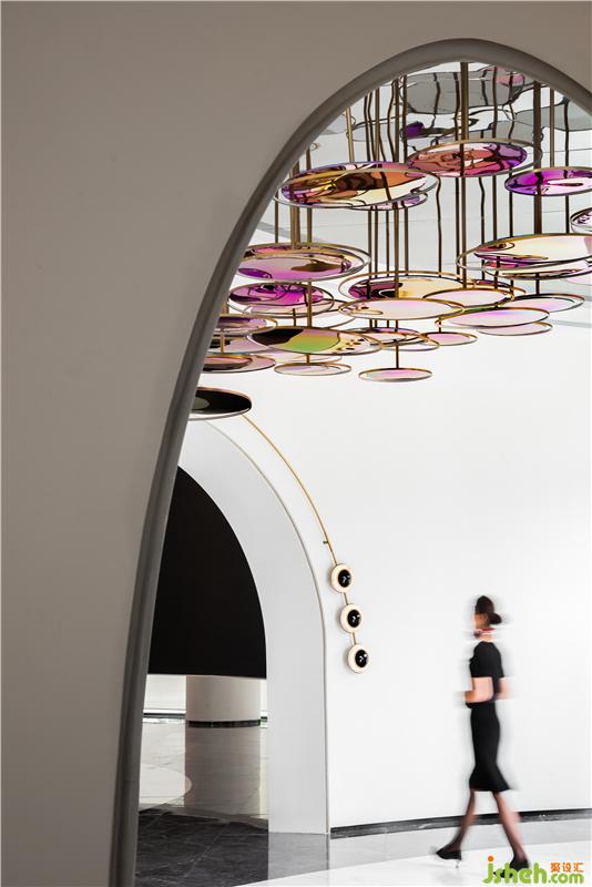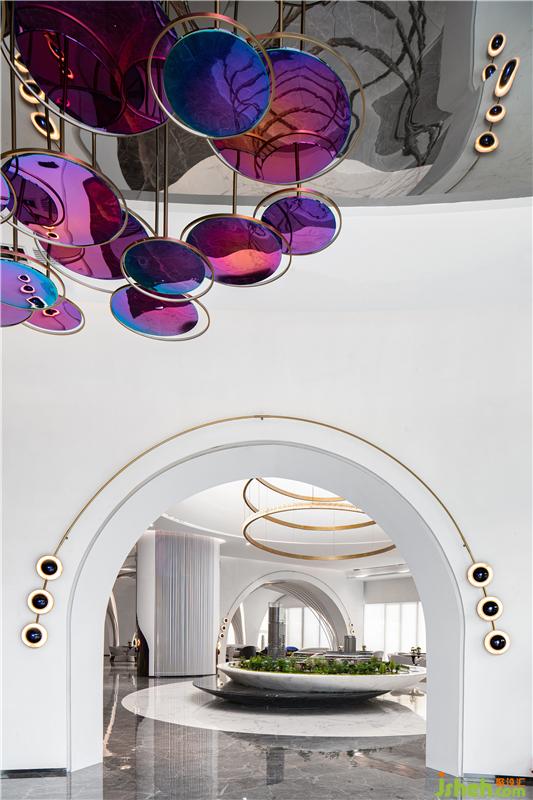 隨處可見的圓環(huán)與弧線,為凝固的空間注入了流動(dòng)與韻律。像是從屋頂葳蕤生長(zhǎng)出來的彩色荷葉,金屬鏡面互相倒影,影影綽綽。絢麗的藍(lán)紫色,稀釋了以白色為主調(diào)的前場(chǎng)區(qū)室內(nèi)環(huán)境所帶來的冷清感,而著上了些許夢(mèng)幻情調(diào)。