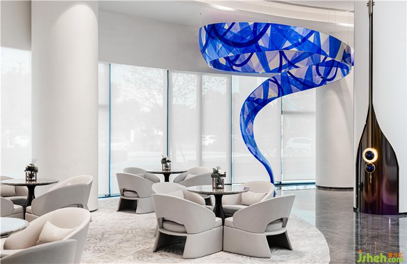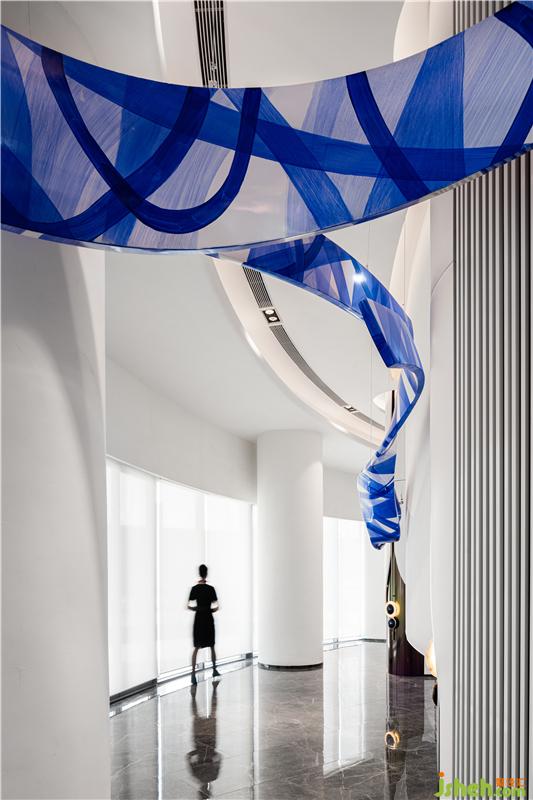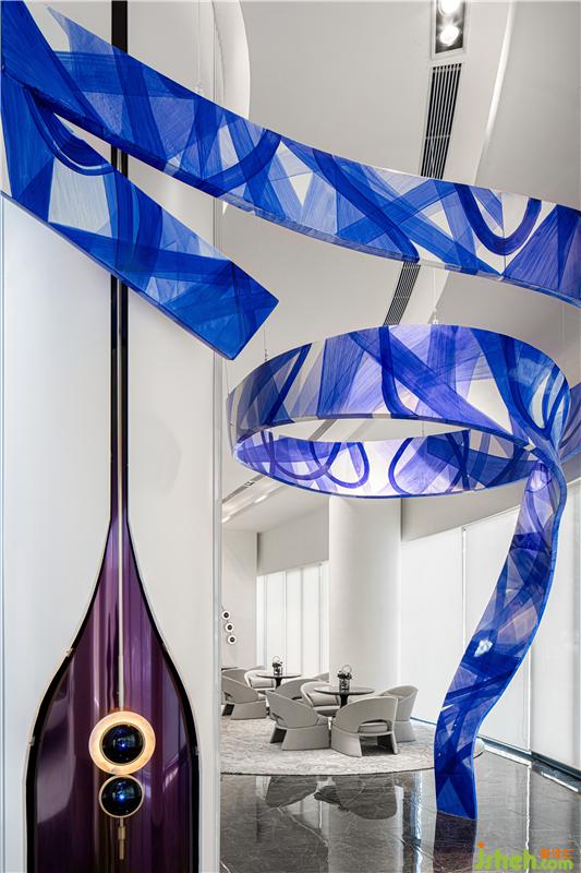 深藍(lán)色的藝術(shù)裝置如絲綢般以優(yōu)美線條在空間中延展,惹來人們的視線流轉(zhuǎn),思緒也隨之靈動(dòng)起來。雕塑、建筑及空間的美學(xué)互相輝映,讓藝術(shù)空間顯得格外渾然天成。裝置主題和伸展的部分用GFRP材質(zhì)做主體,表面用油畫中罩染技法做藍(lán)白相間的藝術(shù)肌理,宏偉的裝置迂回地盤據(jù)于空間之內(nèi),化身為一個(gè)熟悉卻帶有魔幻色彩的奇妙世界。