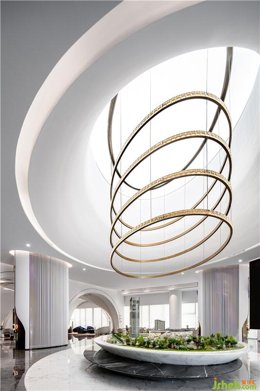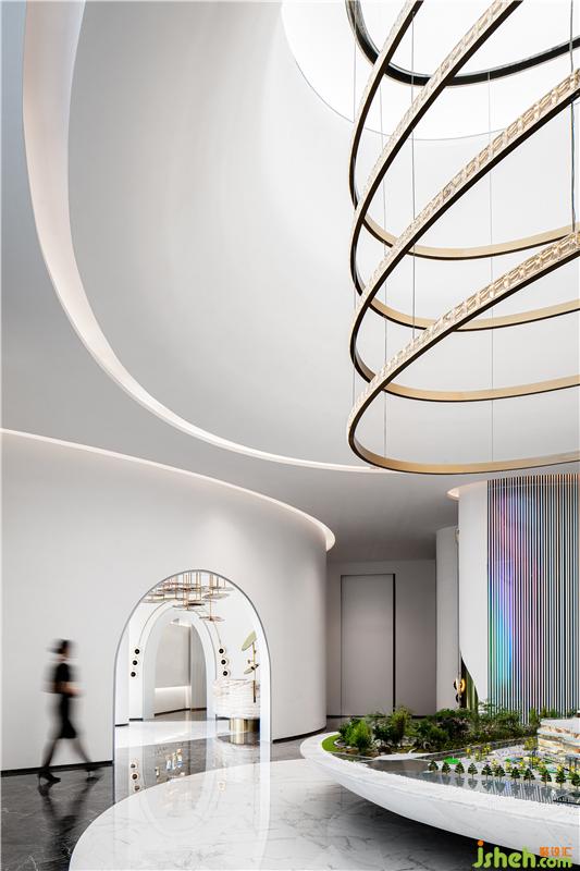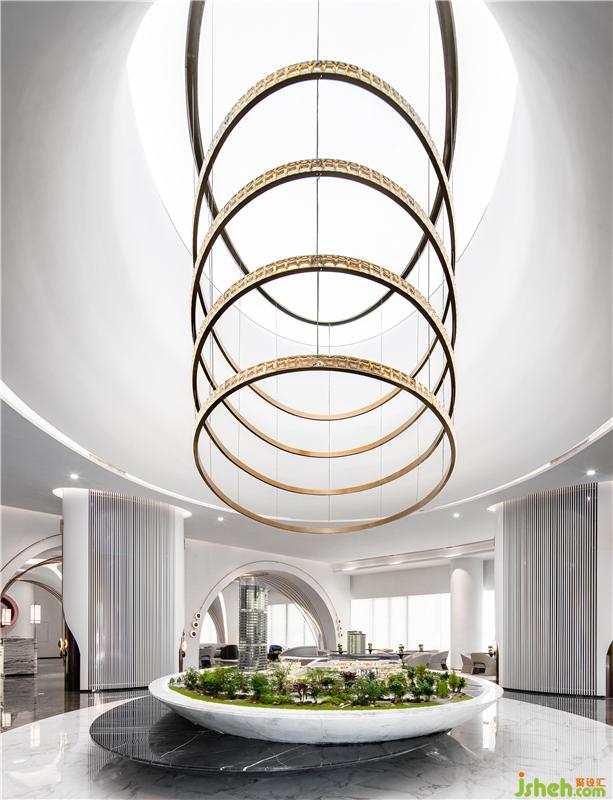 “圓象征著包容,它度量廣袤、寬宏,春風(fēng)大雅,涵容萬物,包舉宇內(nèi),囊括四海,并吞八荒?!比伺c人,人與空間,也盼和諧圓滿。從圓潤屋頂墜下的層層金屬圓環(huán),在燈光的照耀下閃耀著光澤。當(dāng)我們想象置身于沙盤縮影景觀中抬頭仰望,仿佛與古人“天圓地方”的遐想而連接,宇宙浩瀚,寓無限于有限。裝修公司