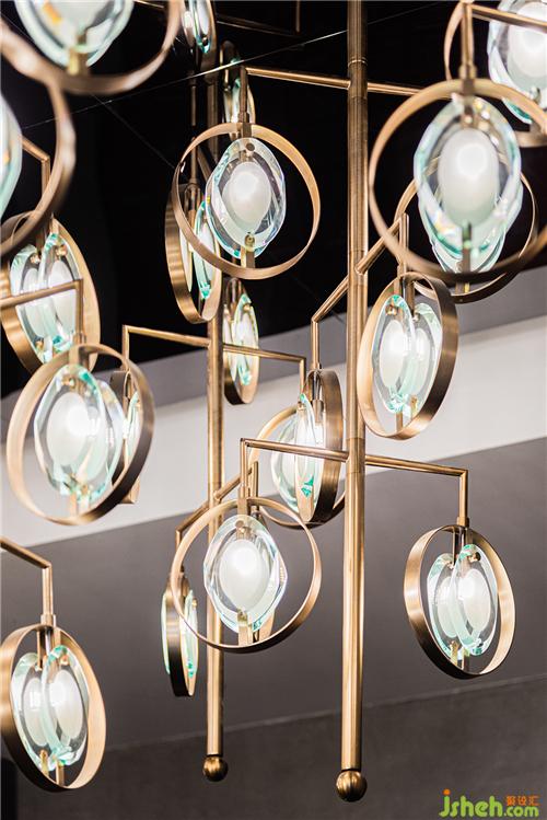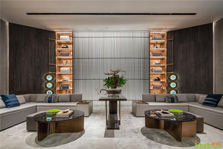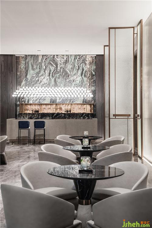 嚴(yán)謹(jǐn)規(guī)整的木門之后,沙盤區(qū)則是一派水光瀲滟的幽靜詩(shī)意。古銅金屬與玻璃交錯(cuò)形成的巨型吊燈自天花垂下,暖黃的光暈淡雅柔和。裝修設(shè)計(jì)