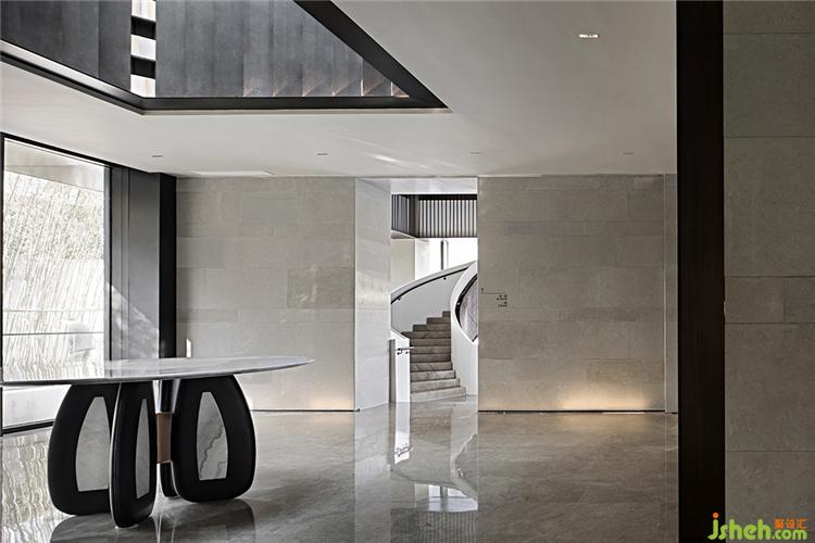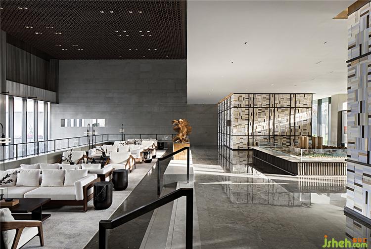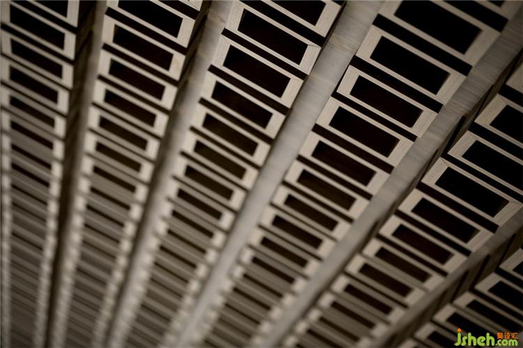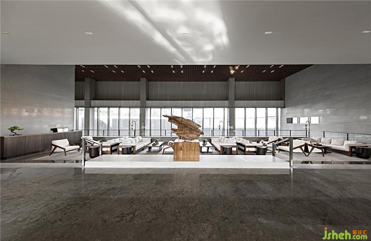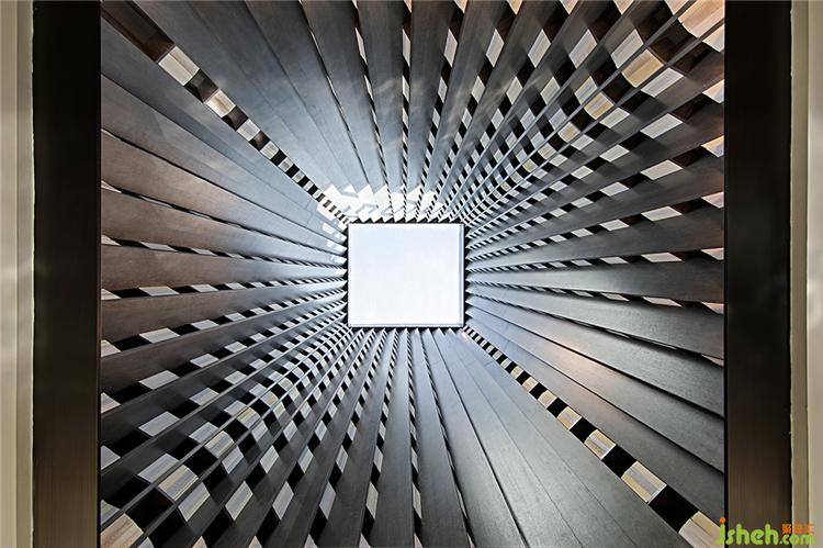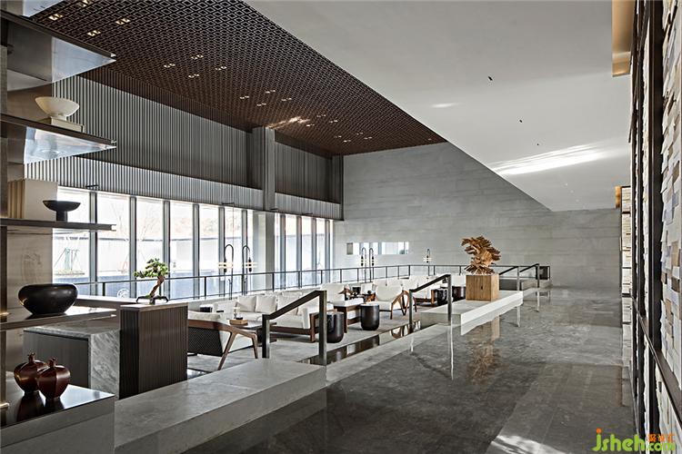 WJID融數(shù)學(xué)思想于設(shè)計(jì),將空間頂部中空,堆疊鋪構(gòu)金屬板材,使天光得以柔和地灑落,售樓處設(shè)計(jì)實(shí)現(xiàn)美學(xué)與功能性的統(tǒng)一。