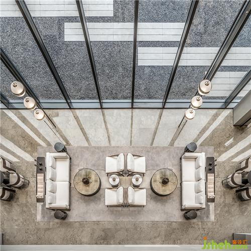 由樓梯轉(zhuǎn)入一層空間,側(cè)面使用篆刻中的陰刻手法刻出扶手,顯示人性溫度的同時(shí),又保有了美學(xué)態(tài)度。