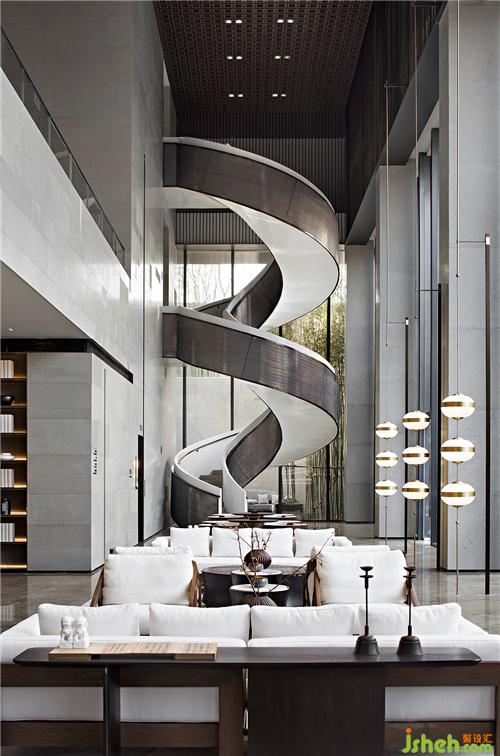 旋轉(zhuǎn)樓梯如一座極具美感的雕塑,優(yōu)雅的弧形設(shè)計(jì)給平鋪直敘中增添了韻律,賦予了前廳靈魂。具有當(dāng)代性的金屬材質(zhì)在樓梯的運(yùn)用中,生出了溫潤(rùn)的東方氣質(zhì)。