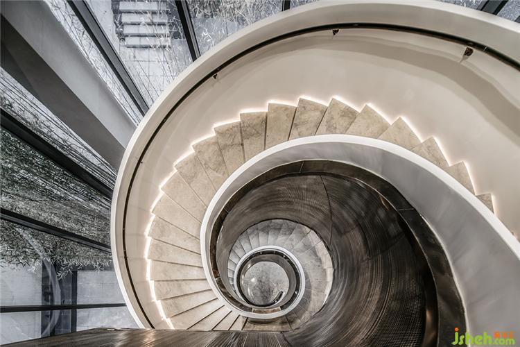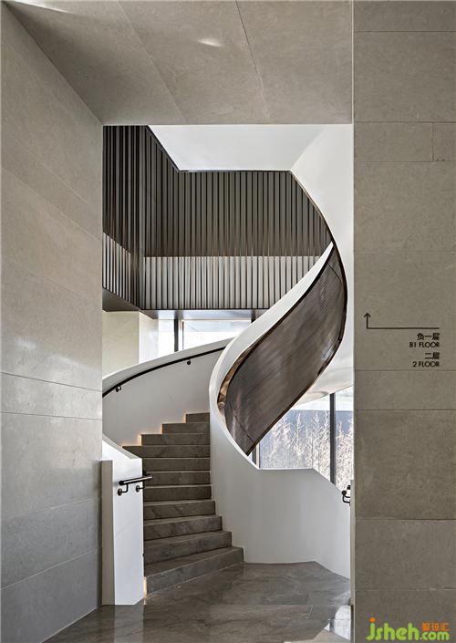 不同視角下,樓梯的線性之美盡顯無疑。影影綽綽中,猶如山間小徑蜿蜒而下,似動非動,安然而飄逸。