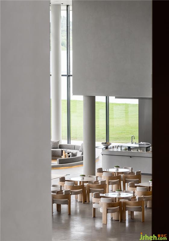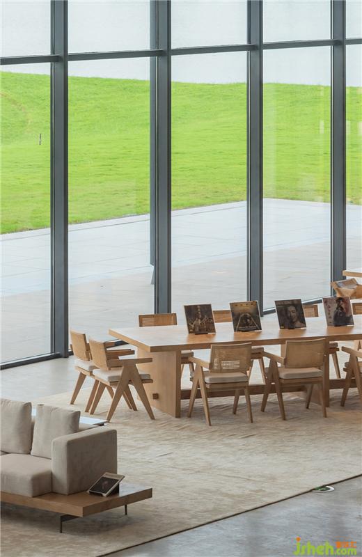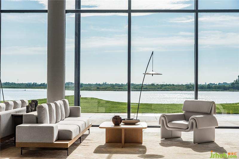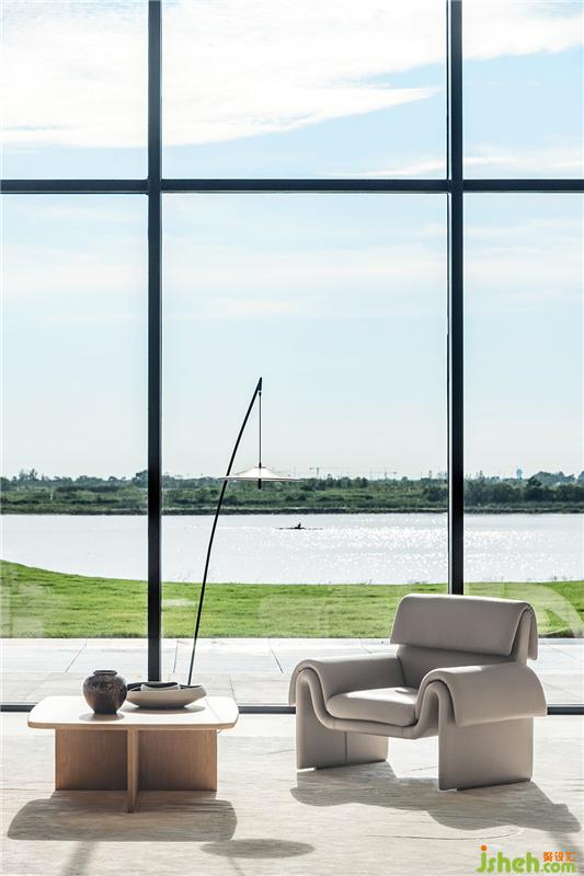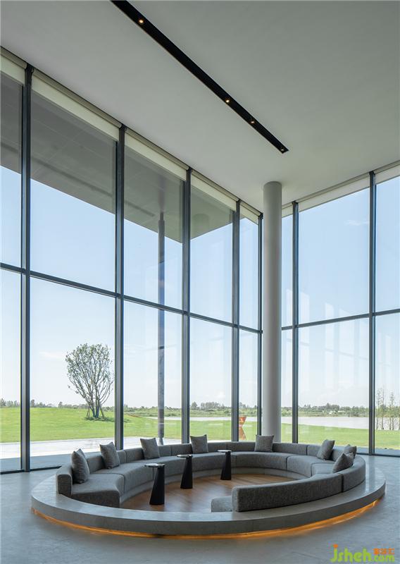 落地窗最大化地引入自然光,打通室內外,讓空間更加通透。軟裝配色與下沉式洽談區(qū)的結構呼應前廳,承襲簡潔的質感。