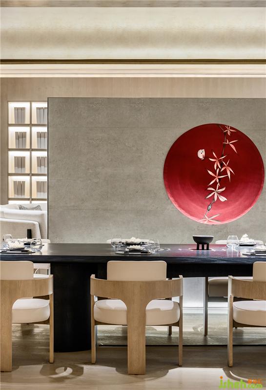 餐廳墻上藝術(shù)裝置的紅色直擊觀者的目光,華麗端雅,生動(dòng)卻不俗艷。一發(fā)新枝斜立其中,明凈搖曳,氤氳成一個(gè)王朝。