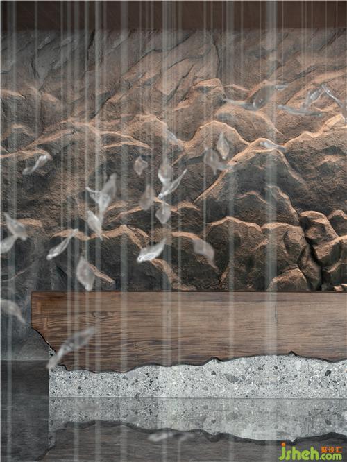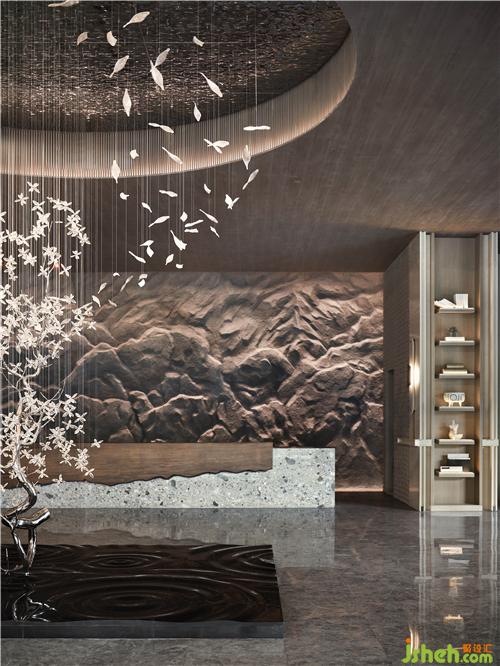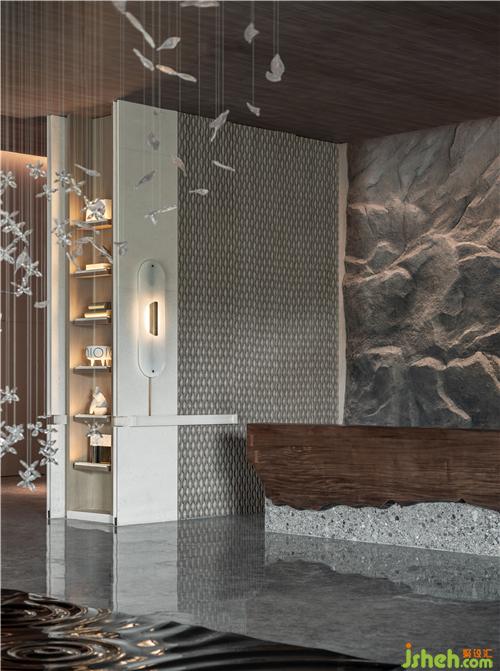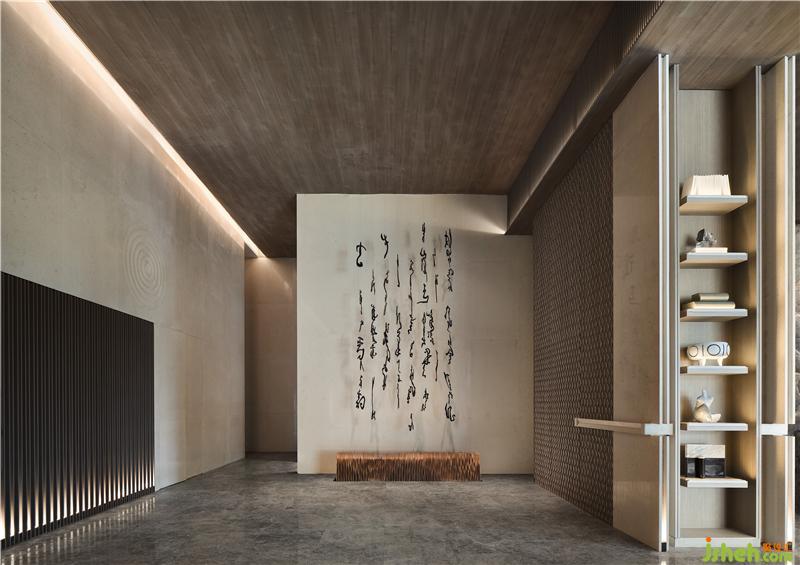文字元素的「古」與現(xiàn)代技法的「今」相互碰撞交融,極簡(jiǎn)空間因?yàn)閹仔醒笱鬄⒌拇笞指眵攘?,大地色系彌漫貫穿于整體空間之中,如身臨山石真境,使人感受舒適、安寧。