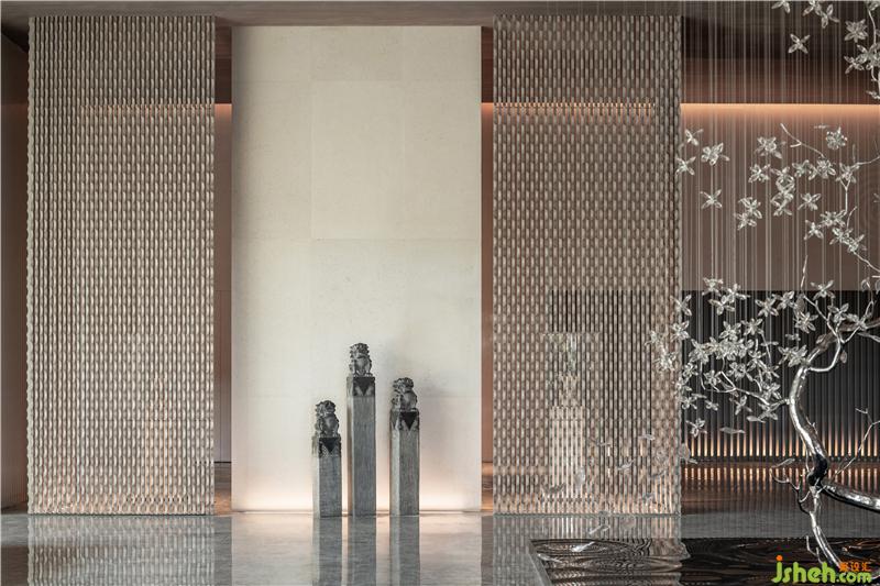 石獅陣肅穆、莊重,金屬現(xiàn)代感墻面以縱向線(xiàn)條依次排列,上海售樓處設(shè)計(jì)玩味出空間儀式感,讓人體味溫馨、細(xì)膩的空間情緒。