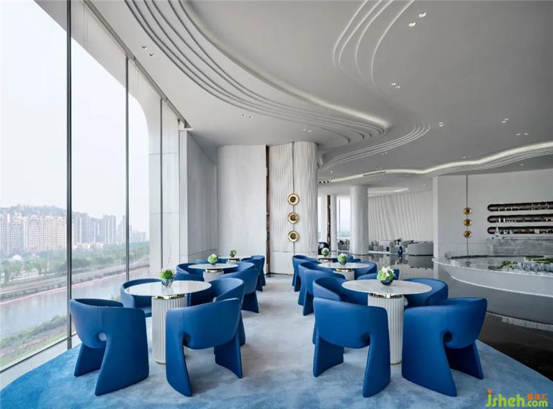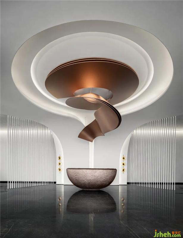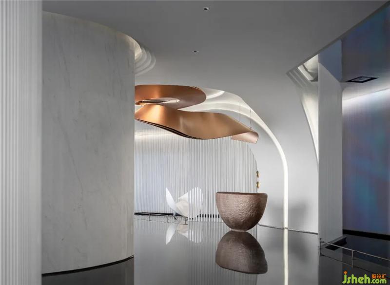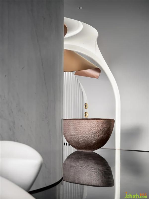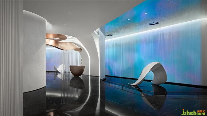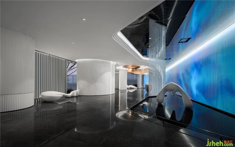 翻卷的海浪將空間柔化,線條起伏不定,充滿探索的樂趣。在晦明變化中,異形處理的結(jié)構(gòu)性線條映射出水岸流動的形態(tài),折射深潛海底一般的微妙感受。