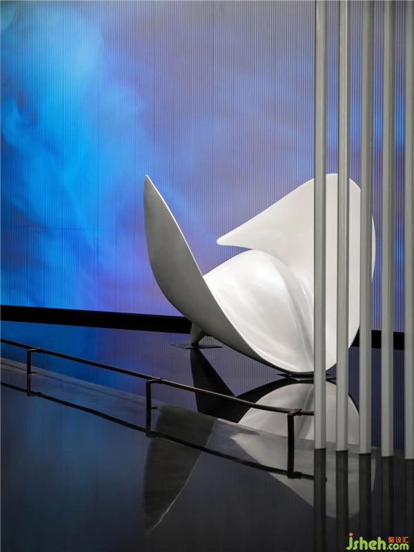 藝術(shù)家說,大海的藍有50種色度。豐富的色度流動于空間墻面,如絢爛之花,與水景相映成趣?;趧討B(tài)墻面海景進行延伸,抽象藝術(shù)形態(tài)裝置如翻卷的浪花,委婉道出來自深海的寧靜獨白廣州營銷中心設(shè)計。