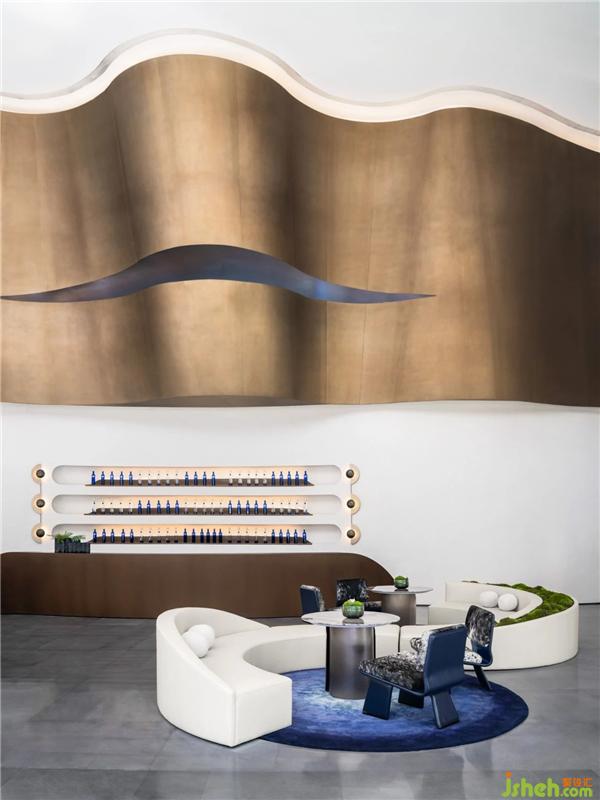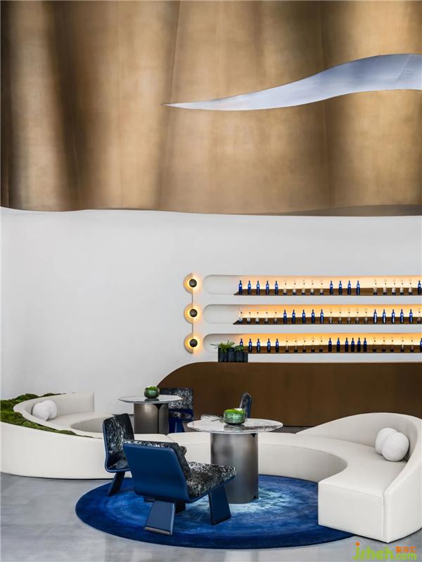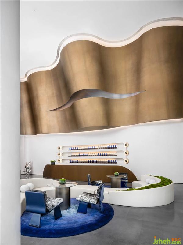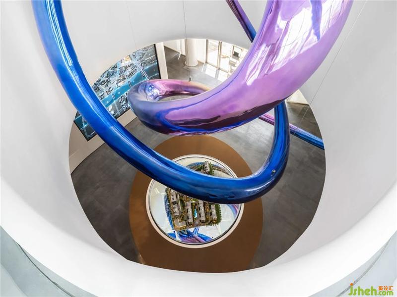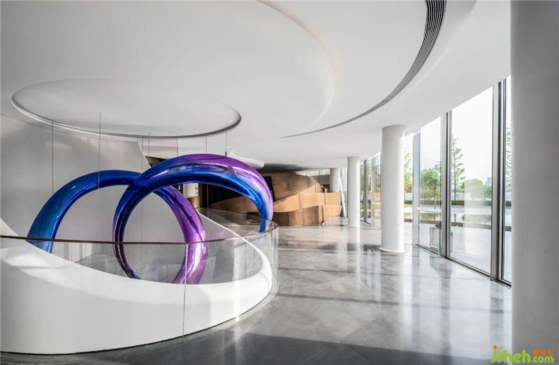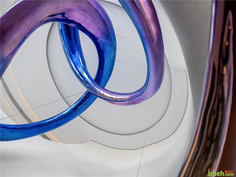 天花空間曲線流麗,意圖展示出一道時空隱喻,連結(jié)著杭州的過去、現(xiàn)在、未來。藝術(shù)裝置「躍升」盤旋空中,流動的態(tài)勢如滔滔流水,完美衍生出項目地理位置的先天優(yōu)勢。