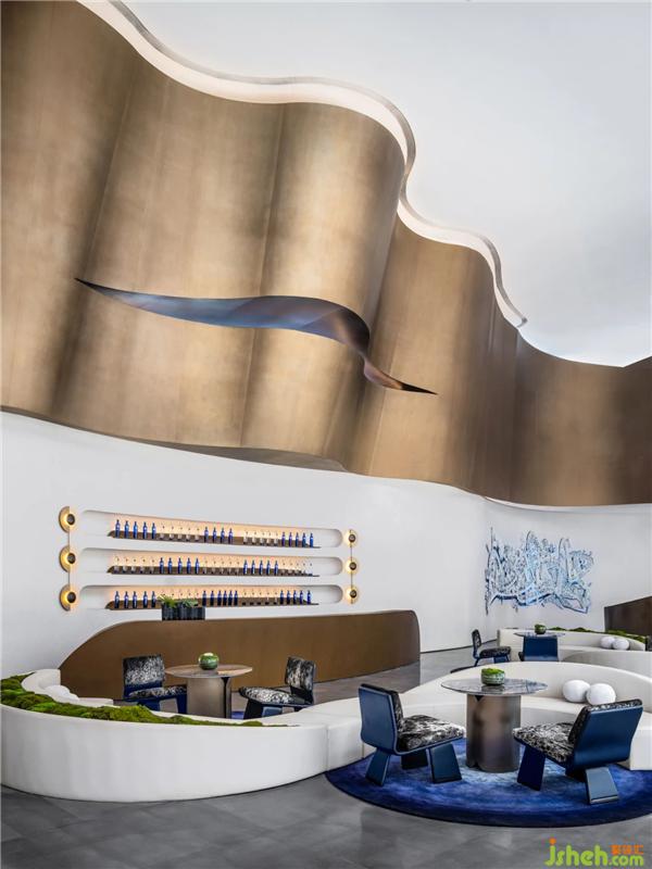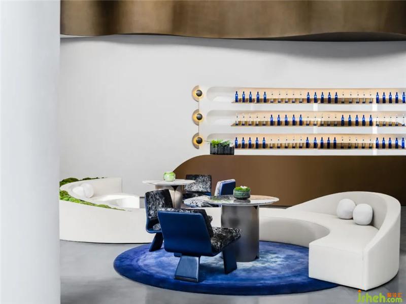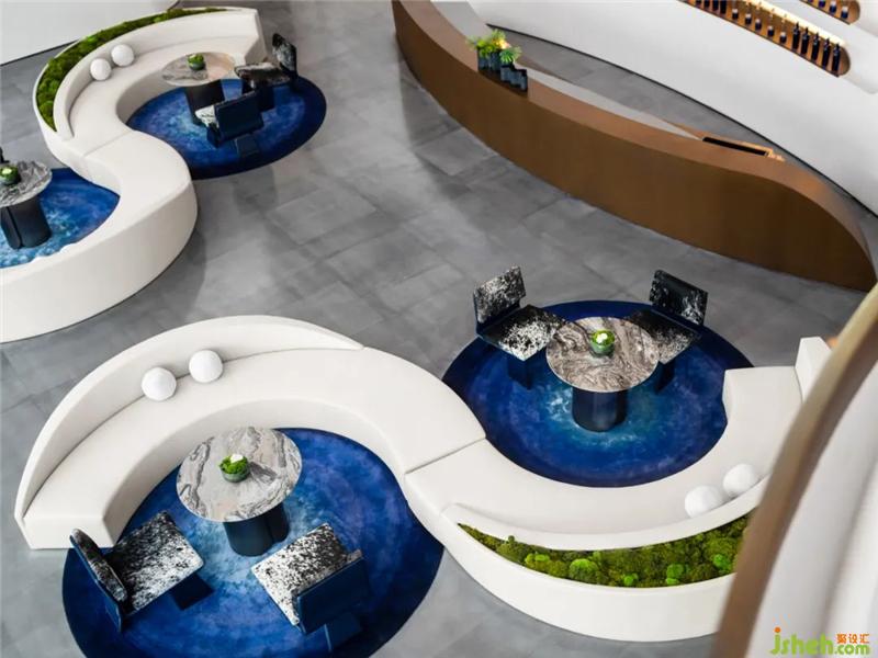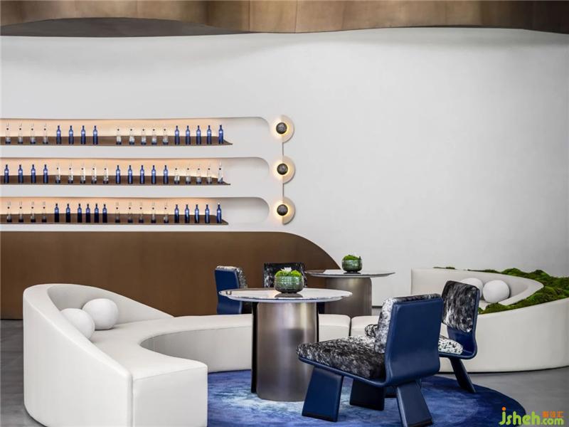 星月之藍(lán)在空間中反復(fù)運(yùn)用,在洽談水吧區(qū)落成一方藝術(shù)圓毯,以及整齊陳列的貯酒區(qū)。設(shè)計(jì)師意圖通過(guò)藍(lán)呈現(xiàn)為一種意識(shí),如星空一般純粹、靜謐,與白的純凈柔軟映照,安放浮躁、喧囂之心。