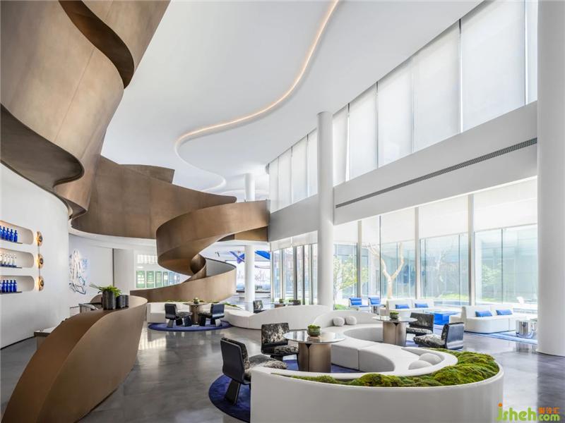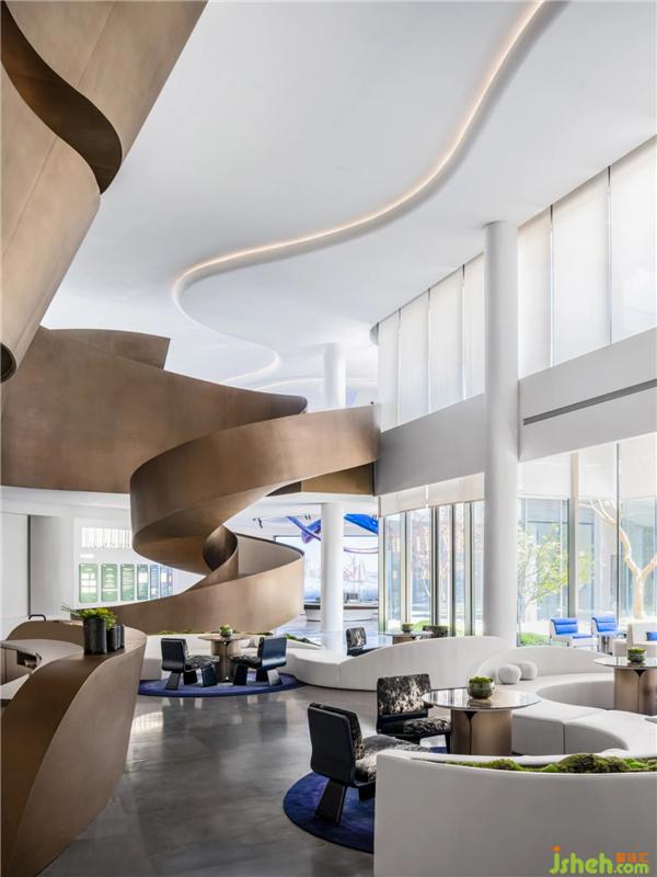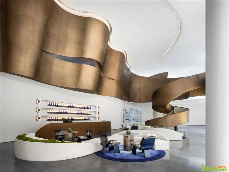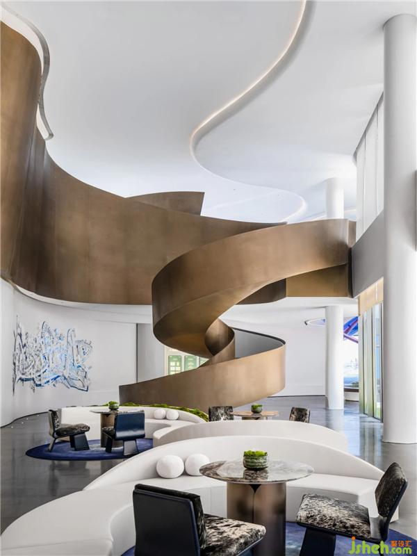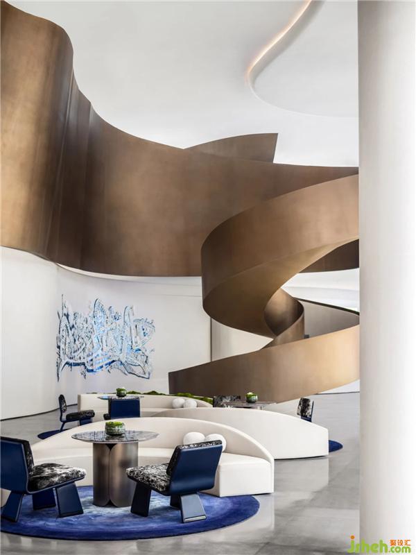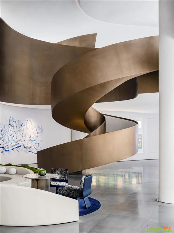 承天梯之勢(shì),望云卷云舒。自地平面升起的旋轉(zhuǎn)樓梯躍升、變化,將空間的視覺(jué)旋律曼妙舒展??臻g形態(tài)翻卷成浪,仿佛被賦予神奇魔力,給人以被環(huán)抱的柔軟。