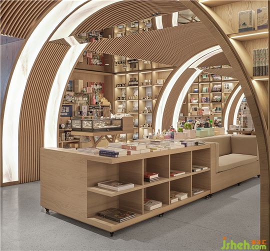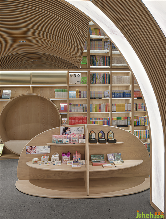 書店設(shè)計(jì)空間的功區(qū)融合中不乏豐富的層次處理,大量運(yùn)用曲面元素,帶來感官層面的舒適。就如同文字直抵內(nèi)心,絲絲入扣,仿佛一場敲打心靈的雨。