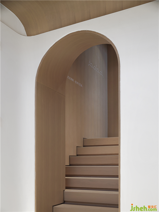 循步“時(shí)空通道”,來到畫廊展廳。樓梯偏于一隅,過渡出空間更深一層的寧靜氛圍,使訪客移步間,更能感受空間的探索趣味。
