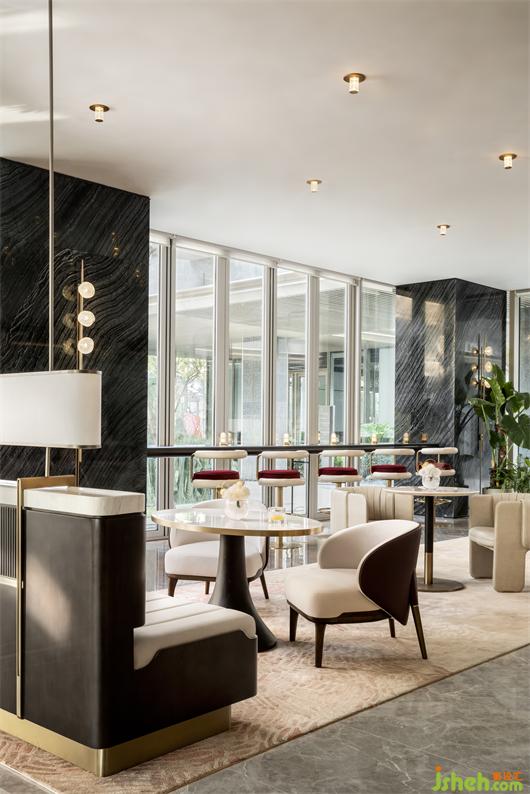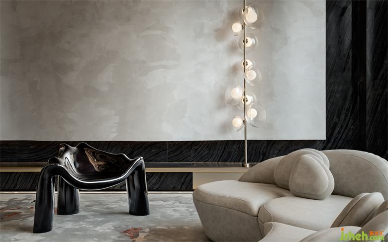 為充分挖掘場域特征,設計師以橙紅作為高光色彩,與此同時,加入黑色、米色營造更富有平和感的現(xiàn)代空間。沙發(fā)椅呈現(xiàn)出自然形態(tài),如同歷經(jīng)海水沖刷的石塊,擁有貝殼般的豐富紋理。