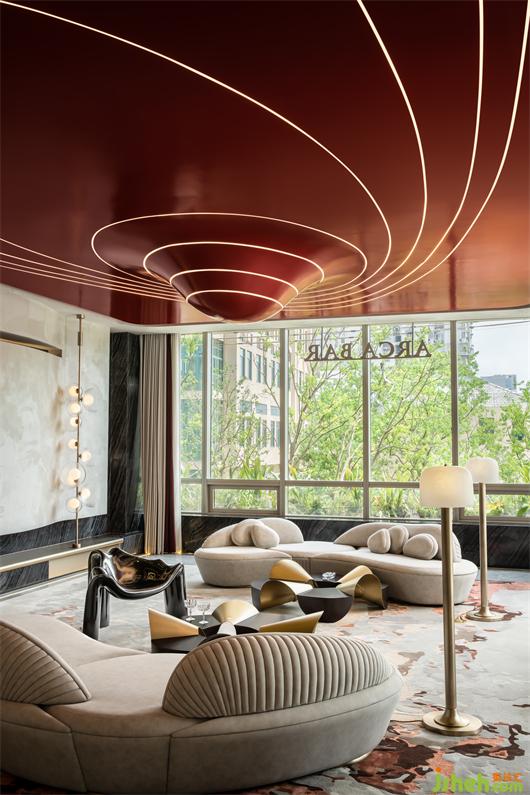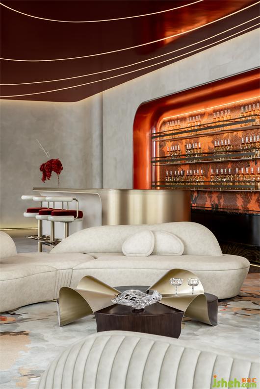 橙色透過暖黃燈帶聚焦空間的高光色,落在水吧區(qū)。熱情洋溢的情緒色彩噴薄而出,顯示奢貴的都市氣息。沙發(fā)椅勾勒對話的美好弧度,構筑出更為皎潔的對話場景。