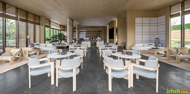 引入山水庭院的東方造景,以山石、亭臺、迎客松等元素塑造優(yōu)雅景致,以小見大,給心靈和視覺帶來更大的冥想空間。