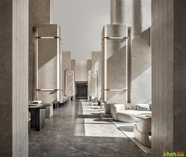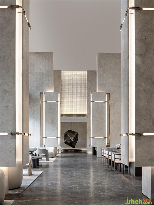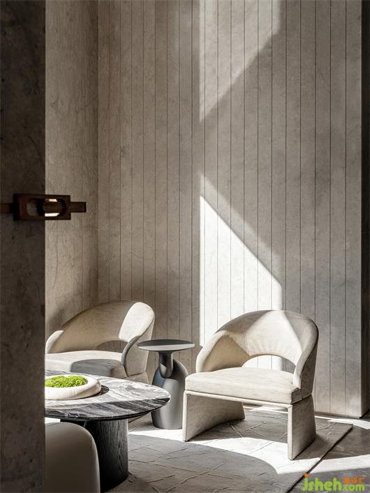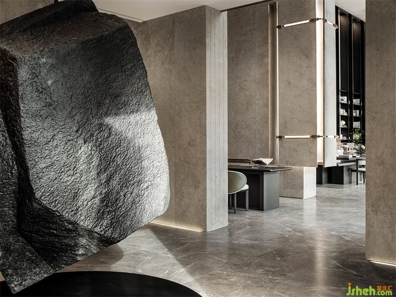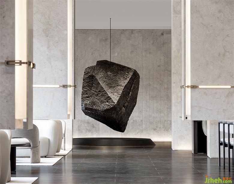 從洽談區(qū)望向盡頭,藝術(shù)裝置“Wurf”赫然懸立,雕塑語言傳遞靜默氣質(zhì),亙古悠遠(yuǎn)。